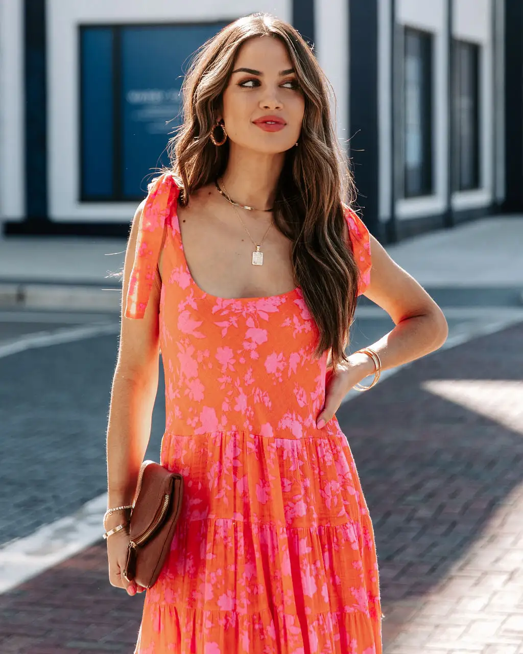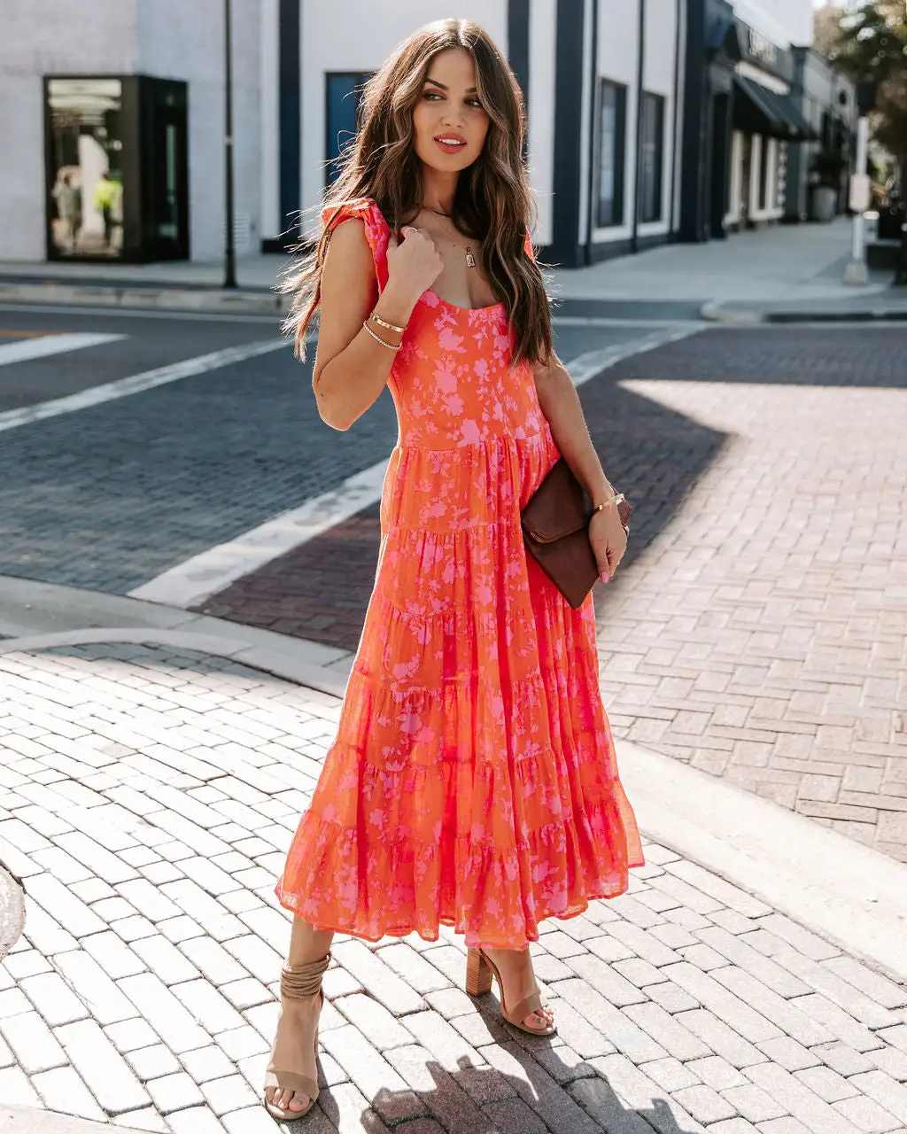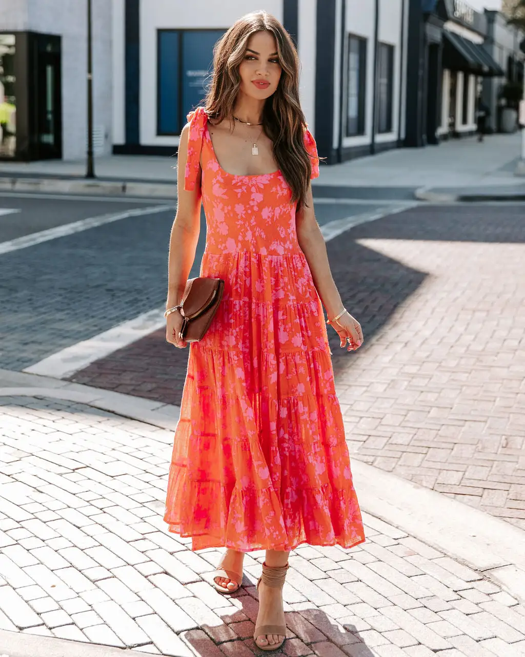 //Best Selling Silhouette// Round out your vacation wardrobe in the Edris Cotton Floral Tiered Midi Dress with coral and pink hues and adjustable shoulder tie straps.