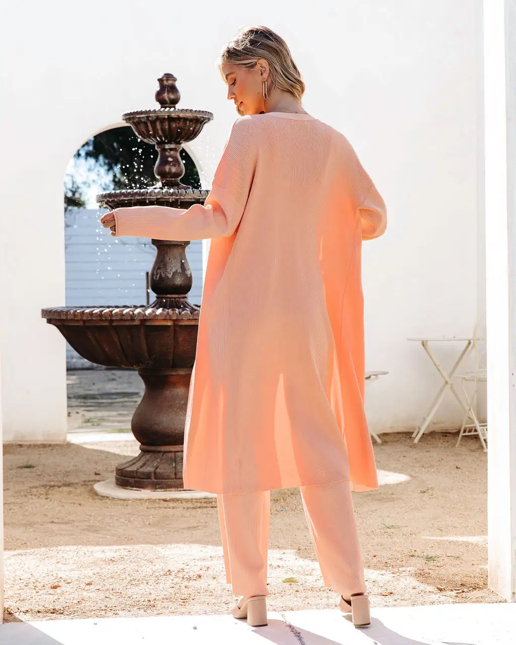 Lounge all day in the Effortlessly Chic Ribbed Open Front Cardigan in peach that features a longer fit.