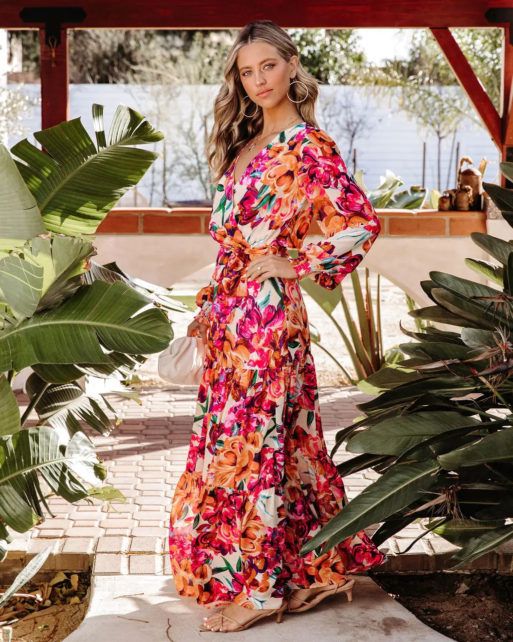 Turn heads in the Elowen Floral Tiered Maxi Dress in multi that features a low neckline.
