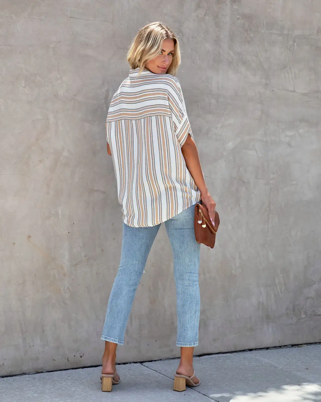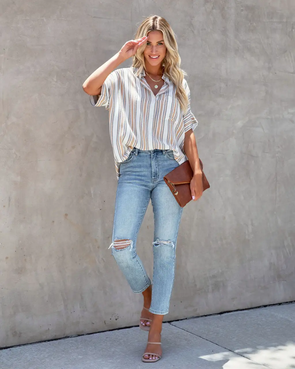 Styled with: Perfect Hoops, Accent Herringbone Necklace, Compass Coin Necklace, Bevie High Rise Distressed Denim, Tori Sandle, and Stella clutch.