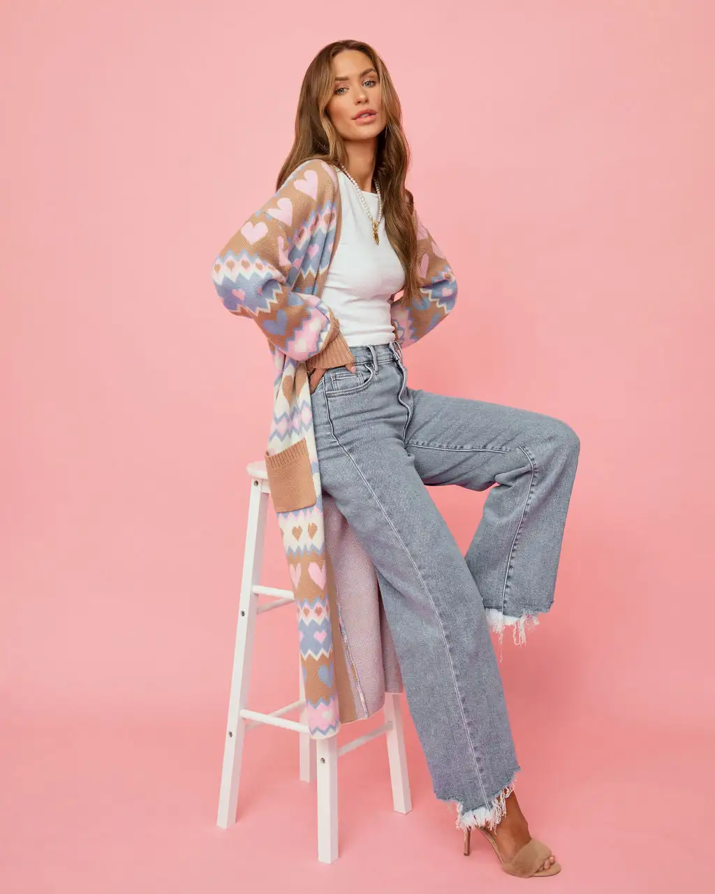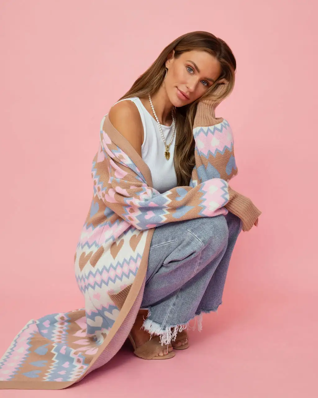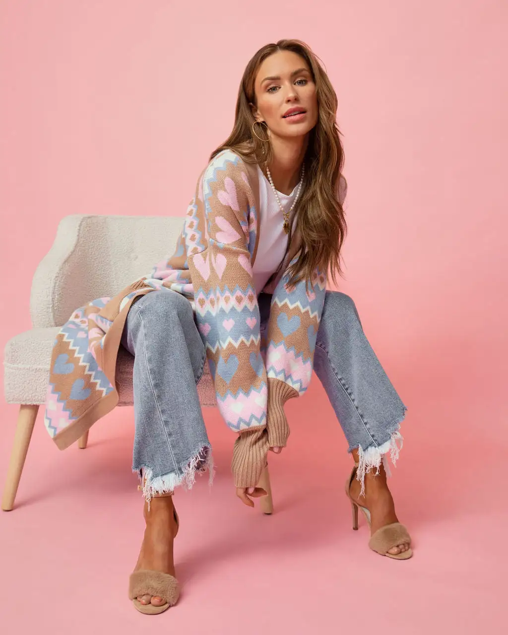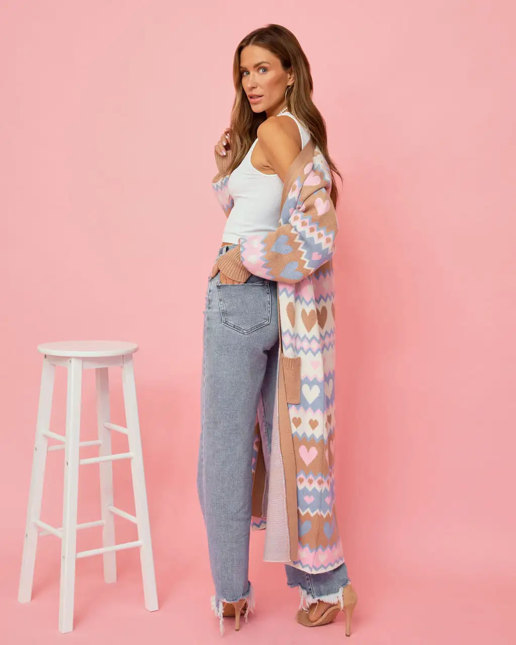 Add a layer of cozy in the Enchantment Pocketed Duster Cardigan in multi that features an oversized fit.