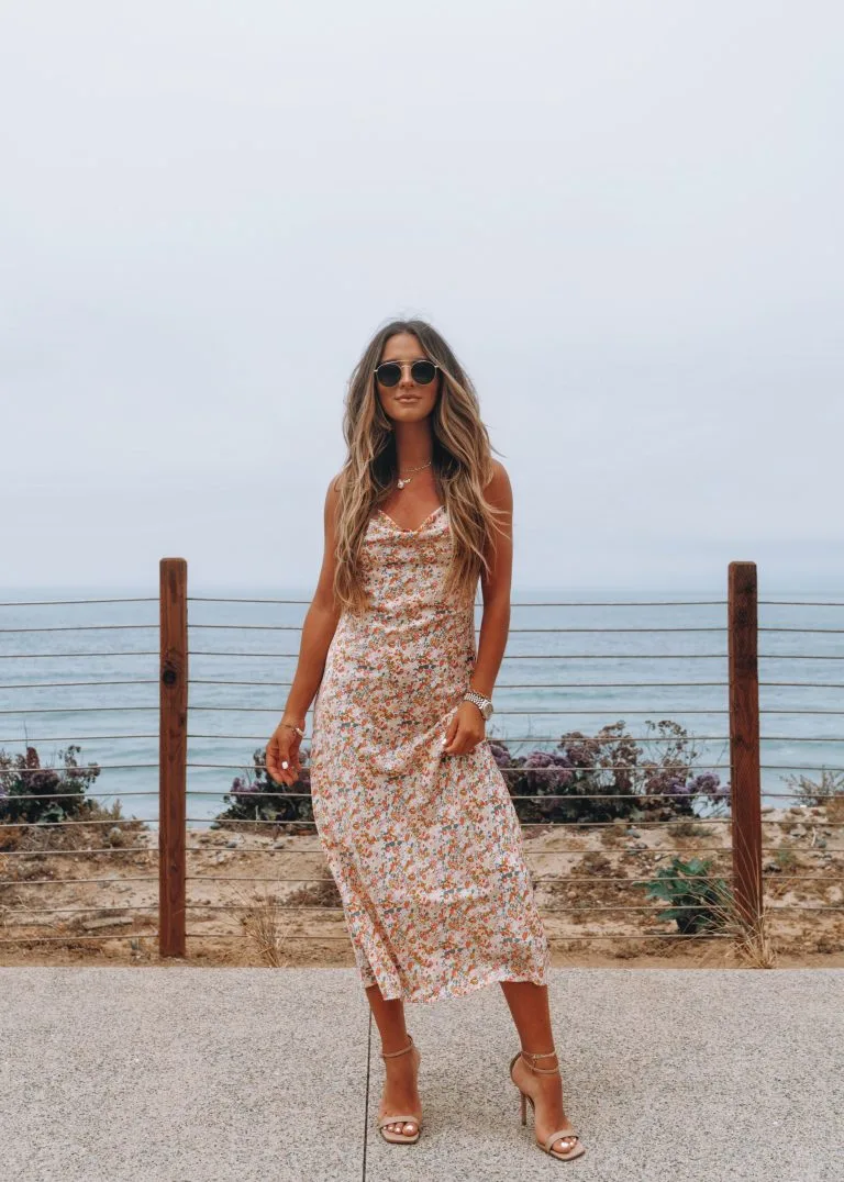 We’re loving the romantic vibes of the Chennedy Floral Slip Midi Dress in pink multi that features a cowl neckline.