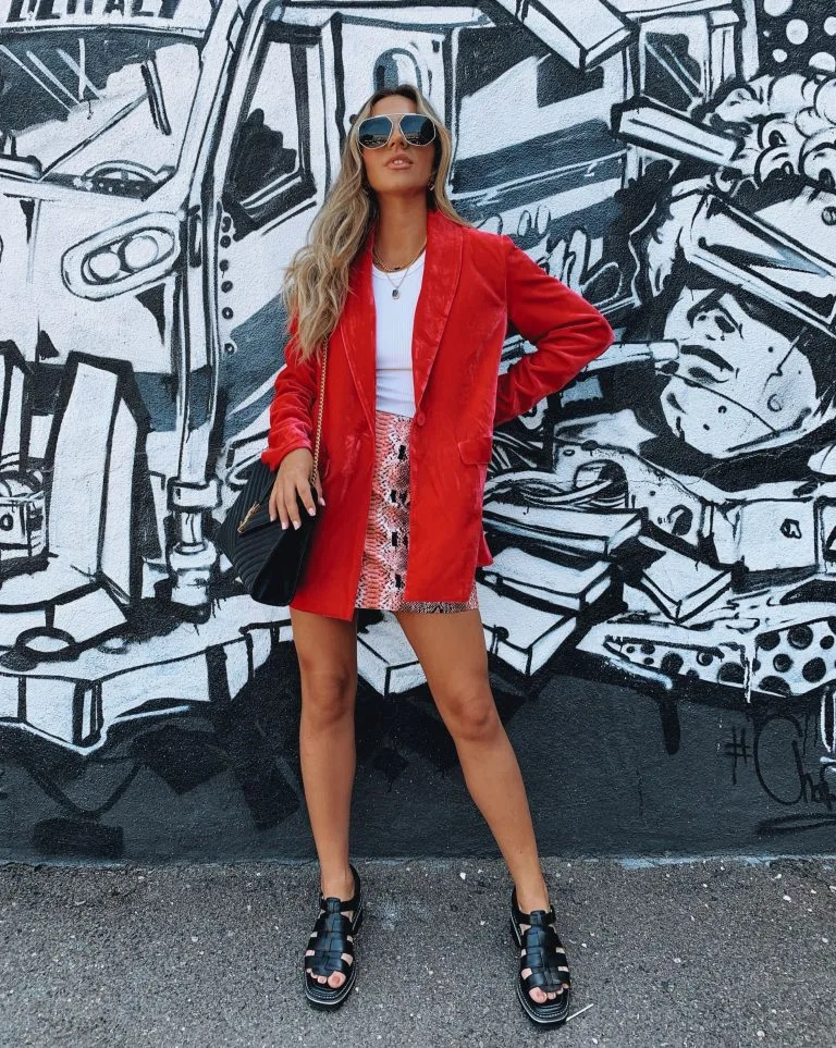 //VICI Exclusive// Our Nyomi Snake Print Embossed Mini Skirt adds flair to any ‘fit! This pink, black, and blush snake print embossed mini is secured with a concealed side zipper closure. Styled with the Chicest Pocketed Velvet Blazer.