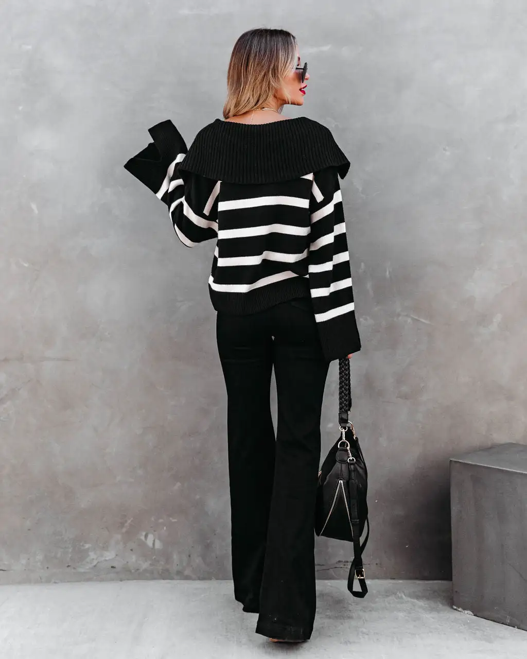 Get your hands on our Maxwell Striped Knit Pullover Sweater in black that features wide sleeves.