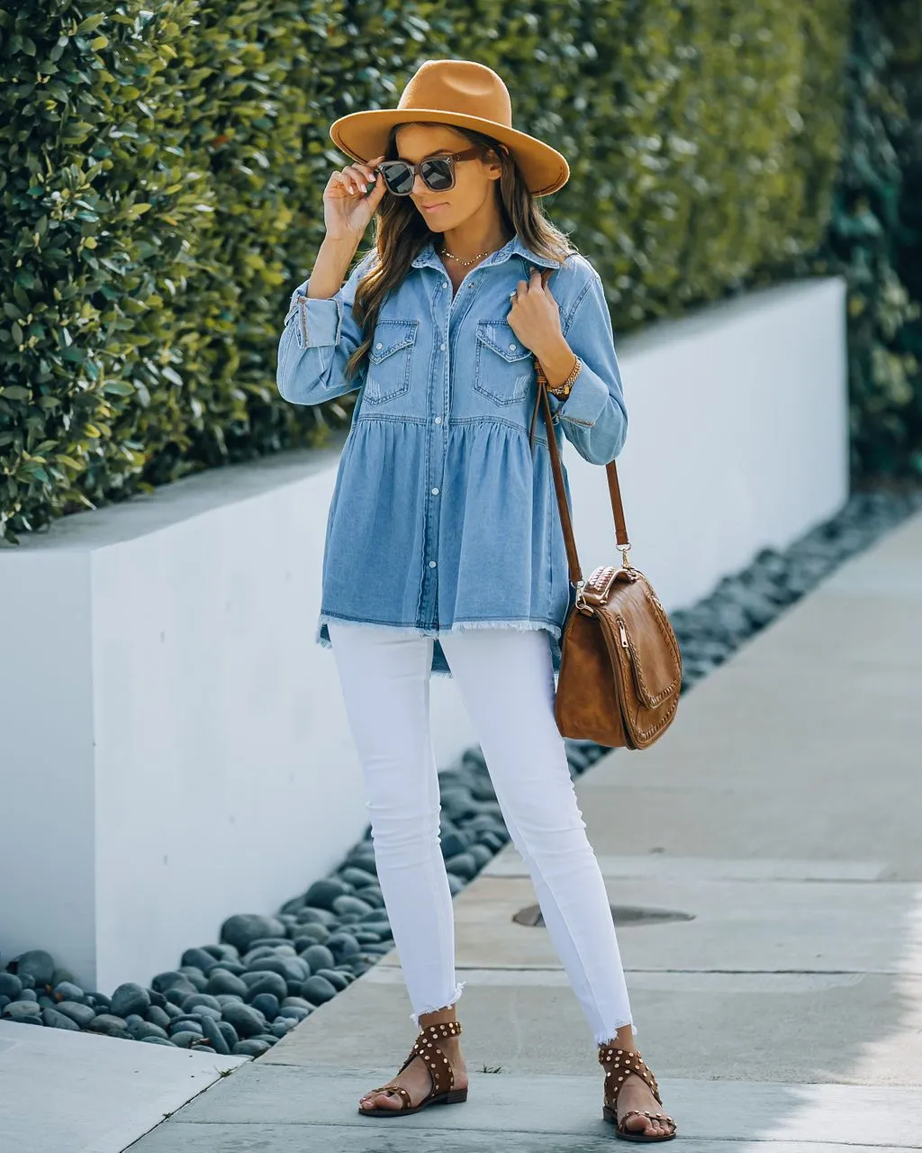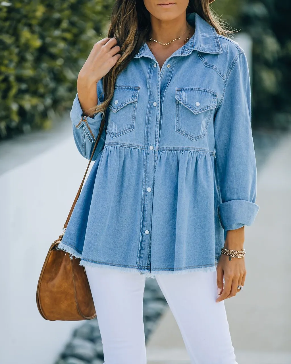 The Myres Cotton Chambray Babydoll Top is a light blue cotton chambray hue with a collar and a frayed hem.