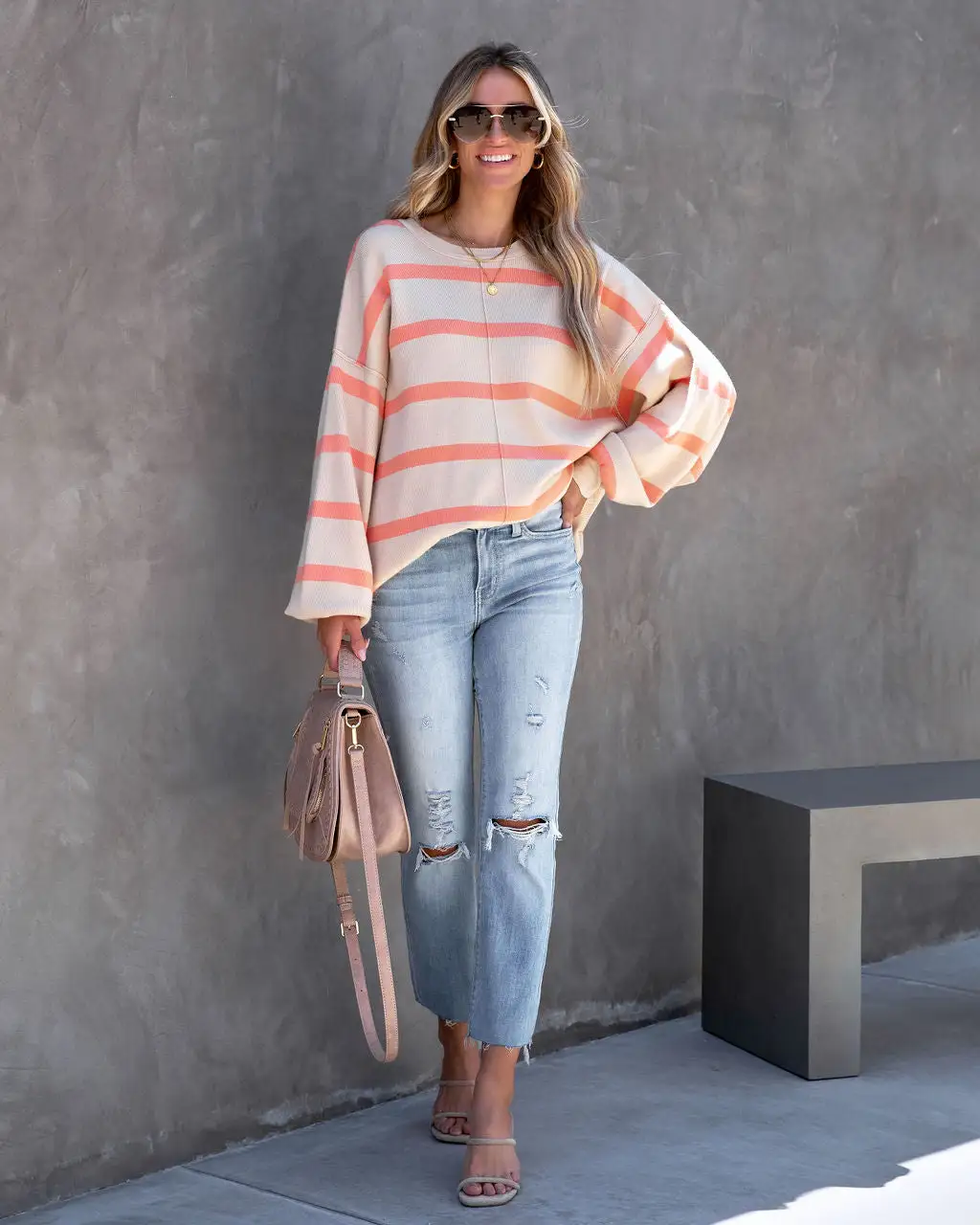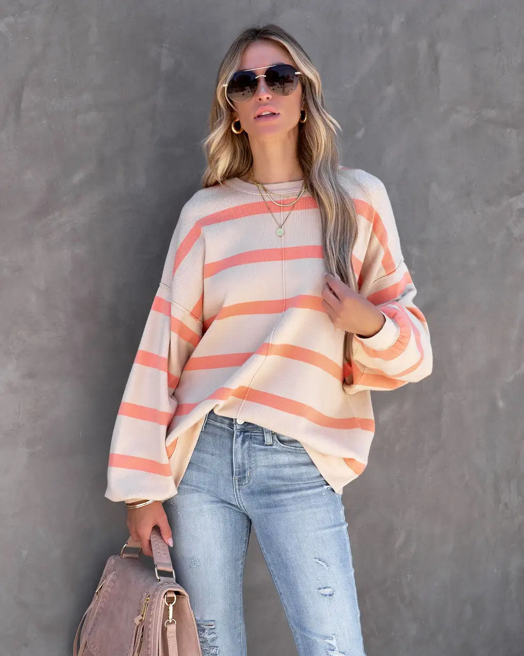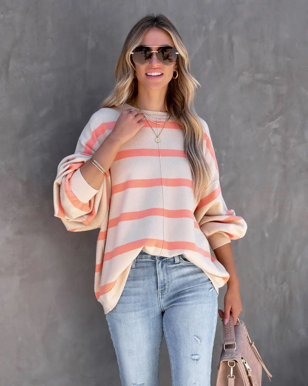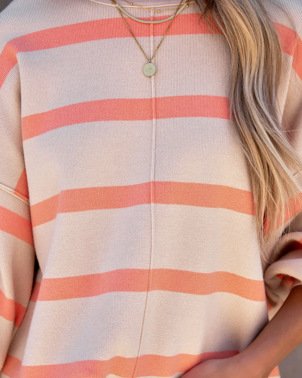 Keep it cozy in the Equinox Striped Premium Sweater in coral multi that features a crew neckline.