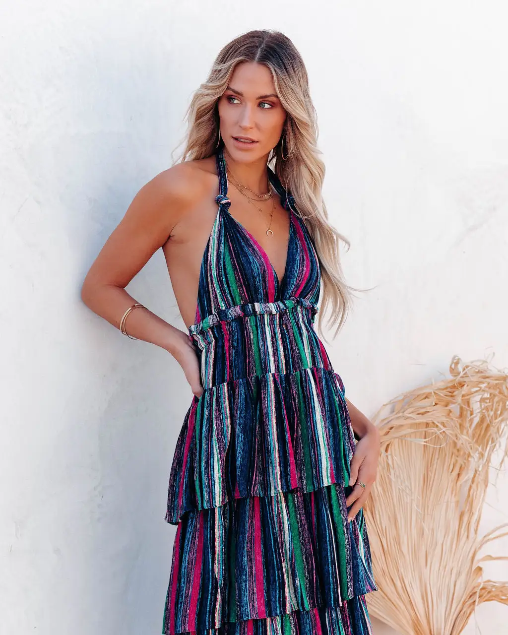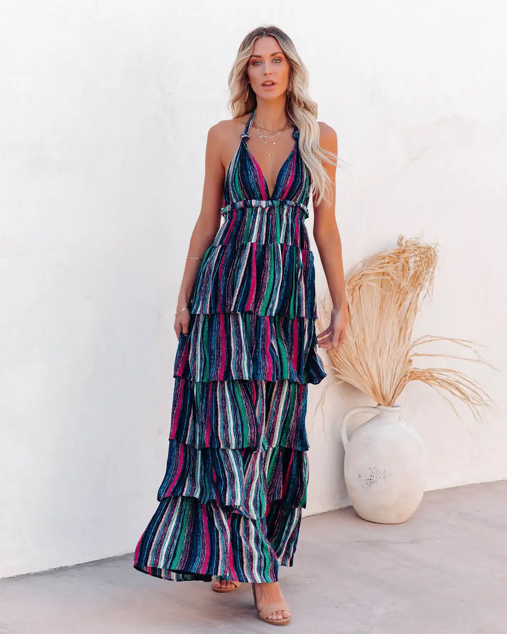 //Best Seller// Let’s give a round of applause for the Esperanza Tiered Halter Maxi Dress with turquoise, green, navy, pink, purple, yellow, hunter green, black and ivory highlighter-inspired hues that show us bold colors and movement!