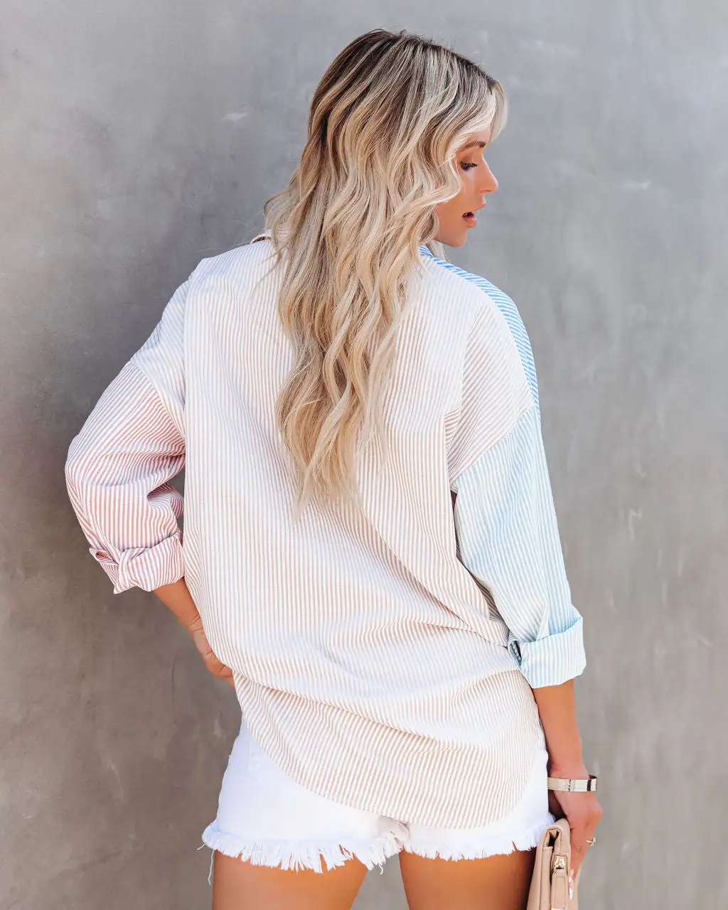 //Best Seller// The Eureka Cotton Blend Colorblock Button Down Shirt is two-in-one fun in mint, blue, dijon, mauve, and white stripes.