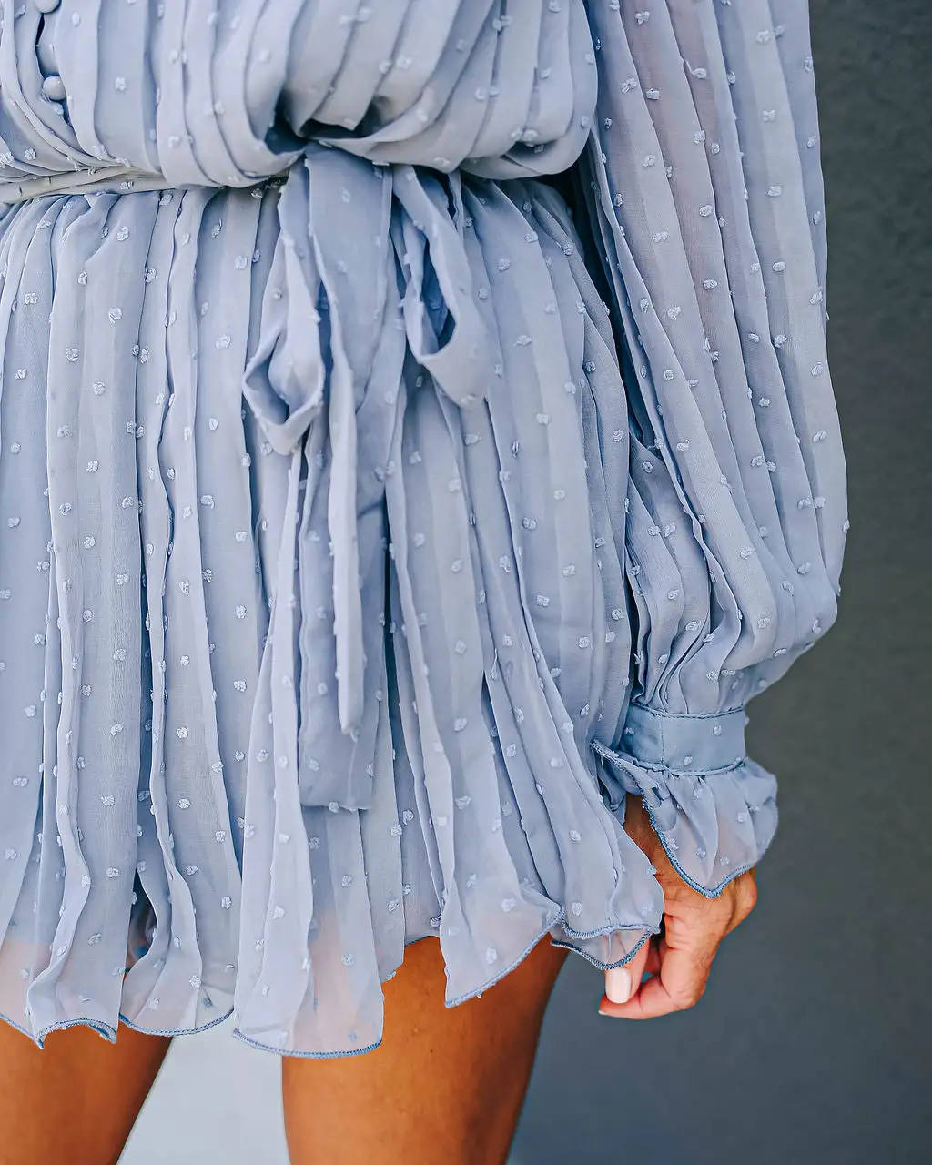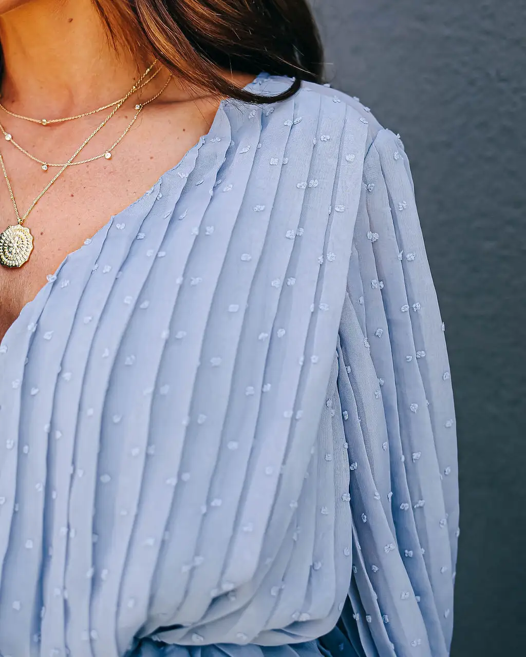 Our Exclusivity Swiss Dot Pleated Romper features a fully pleated light blue swiss dot fabrication. Designed with a v-neckline, cuffed long sleeves and a button down front closure. The billowy fit accentuates at the waist with an adjustable fabric tie. This flirty ensemble finishes with a curly ruffled hemline. Pull your hair back and slide on your heels because you’re going out tonight! Styled with the Diamond Solitaire Pendant Necklace, 5 Disc Choker, Mosaic Coin Necklace, Royale Heels and the Stella Crossbody Envelope Zip Clutch.