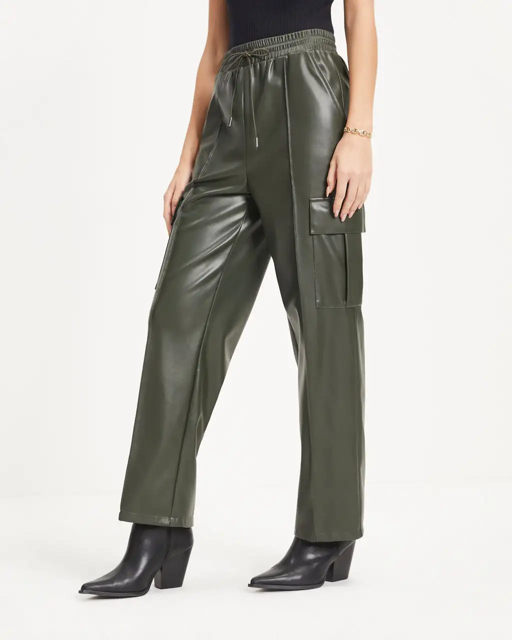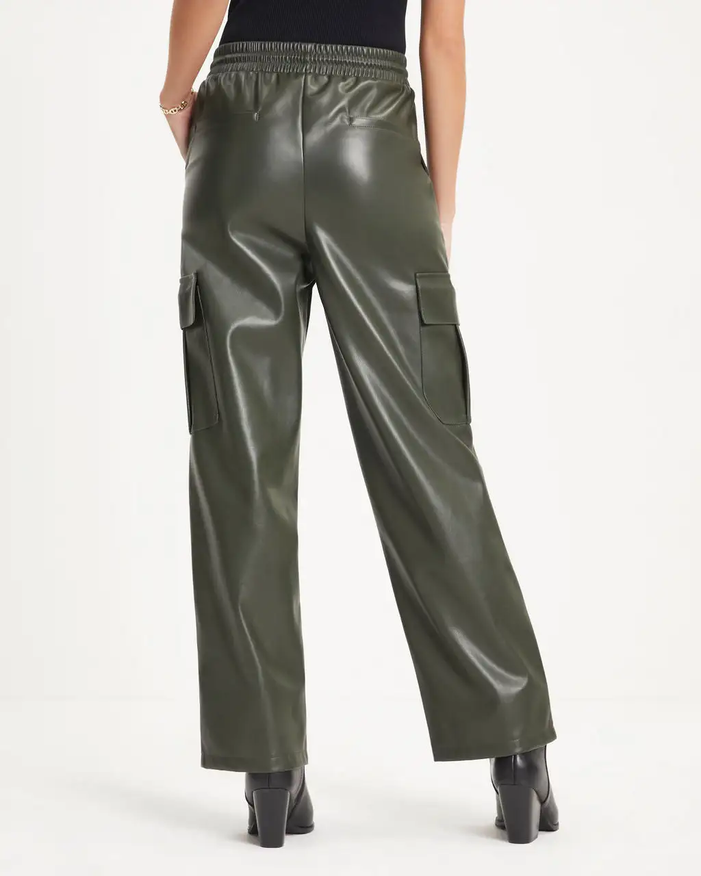 Cool meets trendy in the Explore The World Faux Leather Cargo Pants in dark olive that features a straight leg.
