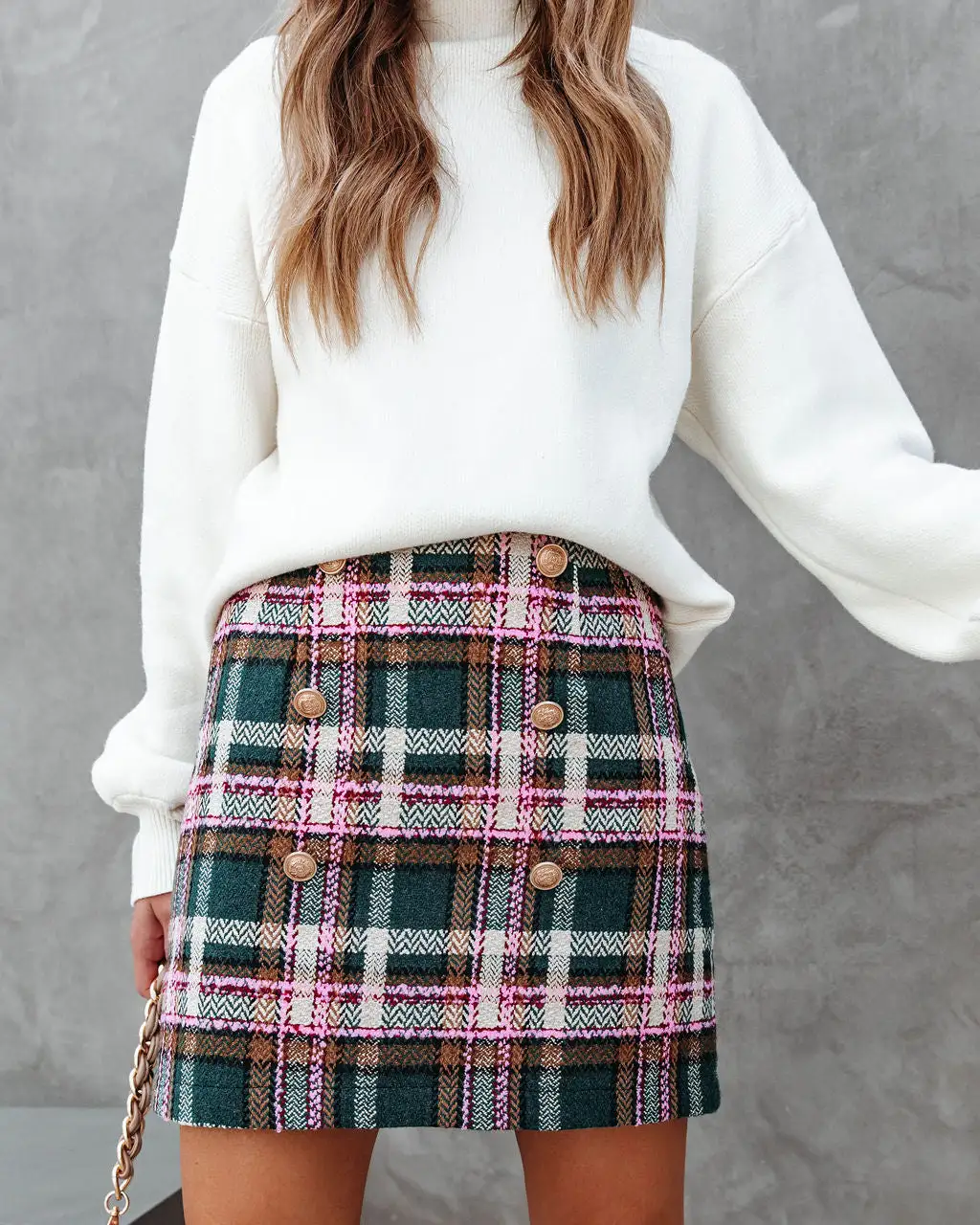 Your Fall wardrobe needs the Bring It On Plaid Mini Skirt in green multi that features a faux gold buttons.