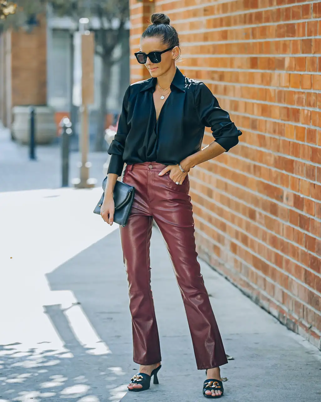 //VICI Exclusive// See a concert in the city in our Meca High Rise Faux Leather Pants! These wine colored pants are crafted with a high waistband. Designed with 4 pockets and a wide pant leg. Secured with a front button and zipper closure. Styled with the Carson Black Frame Dark Smoke Polarized Sunglasses, Chloe Mini Necklace, Compass Coin Necklace, Simple Bangle Bracelet, Stella Crossbody Envelope Zip Clutch, Problem Solved Satin Collared Drape Blouse and Whimsy Heel.