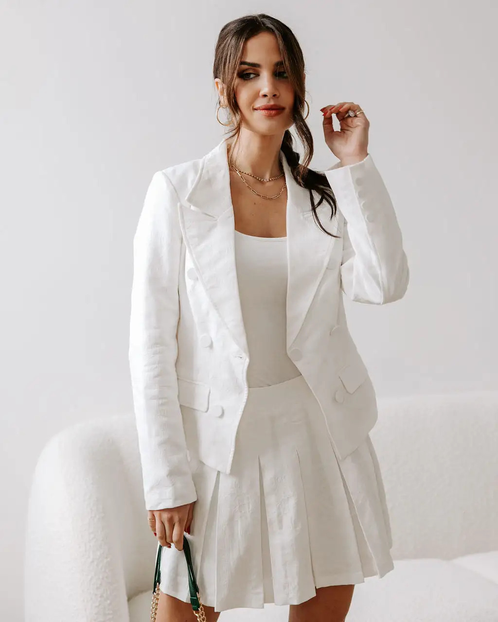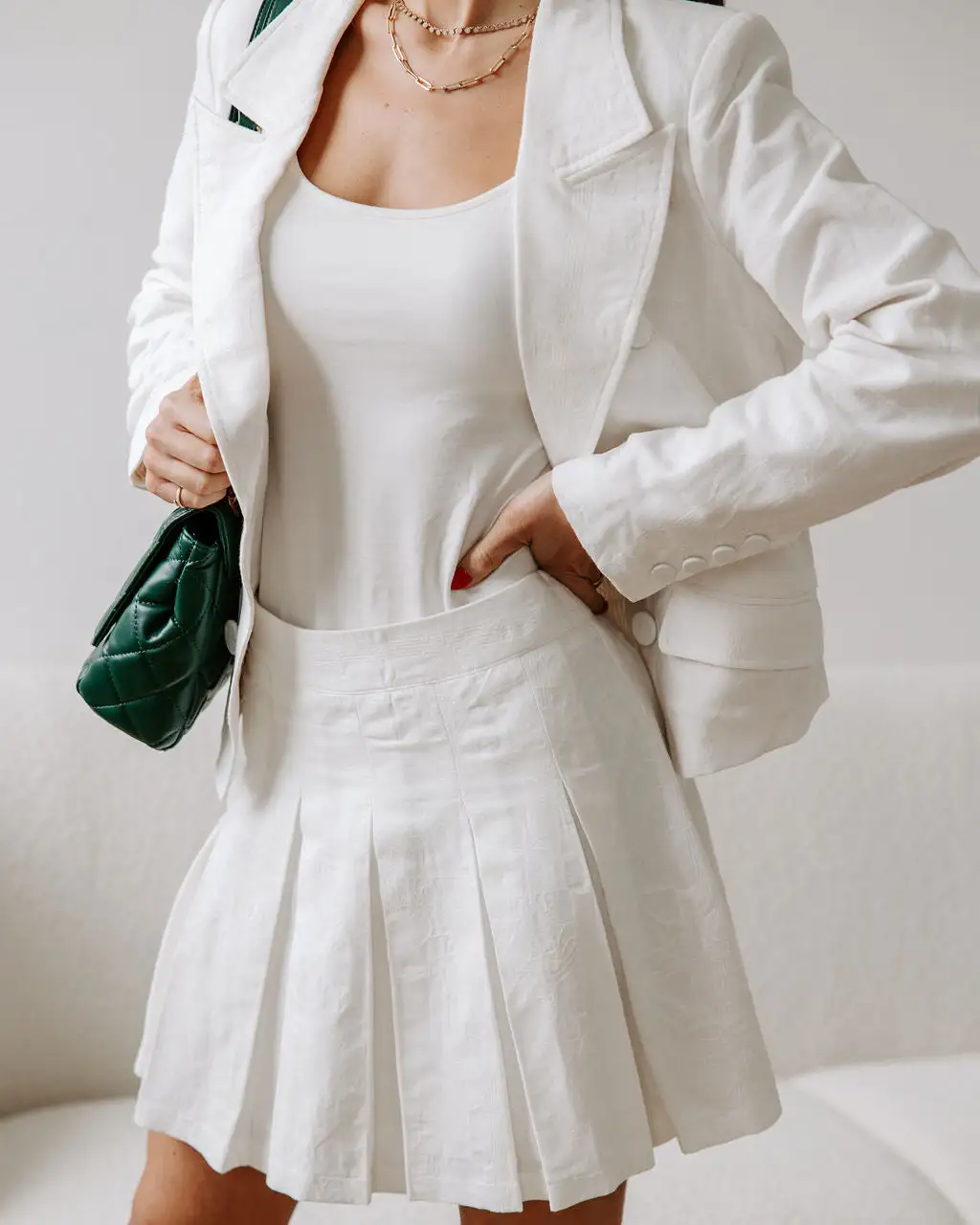 Prep up your wardrobe in the Peace Of Mind Pleated Embossed Mini Skirt in white that features a high rise.