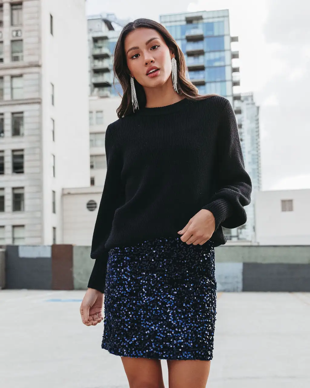 Show off your legs in the Viva La Vida Sequin Velvet Mini Skirt in midnight blue that features a back zipper closure.