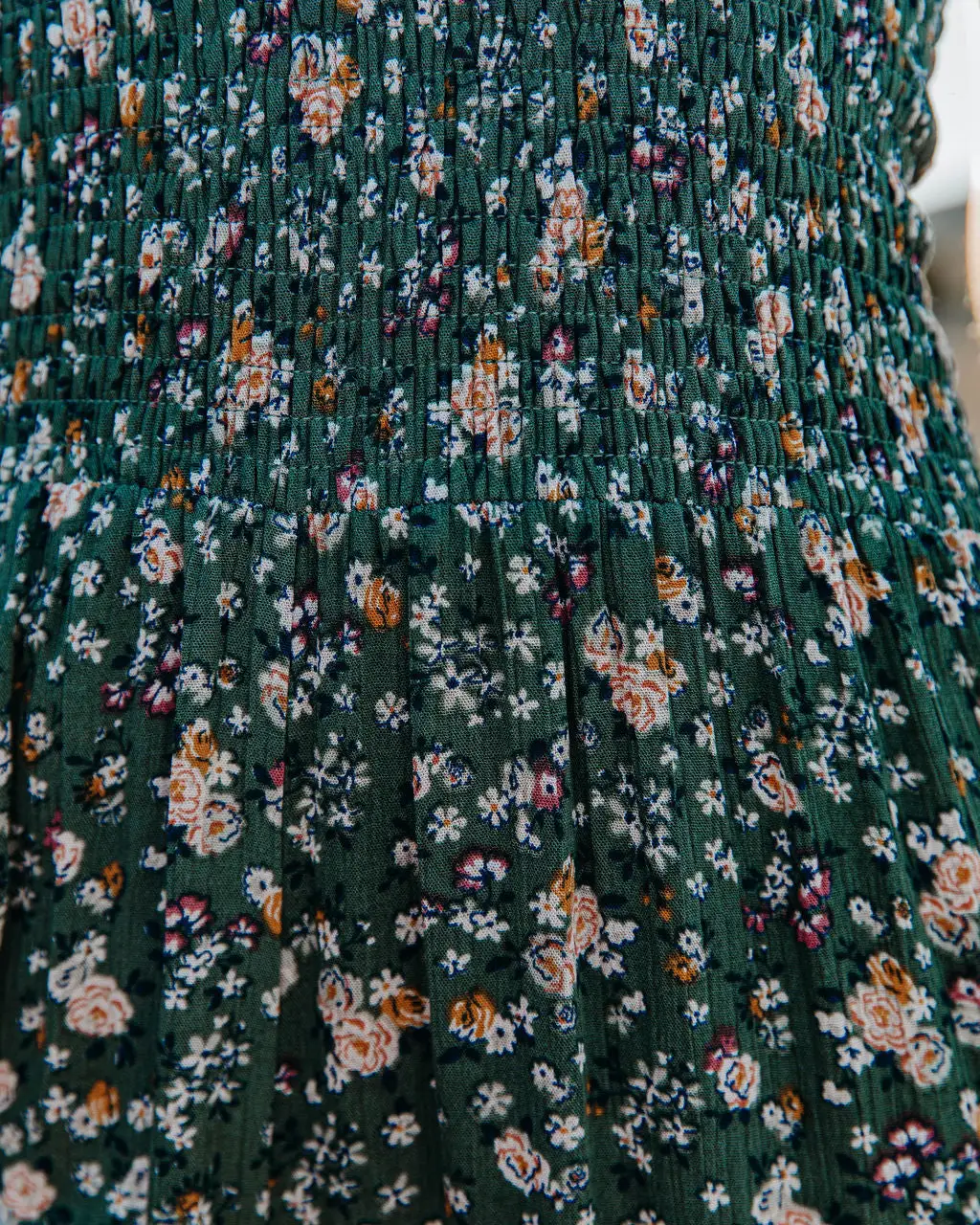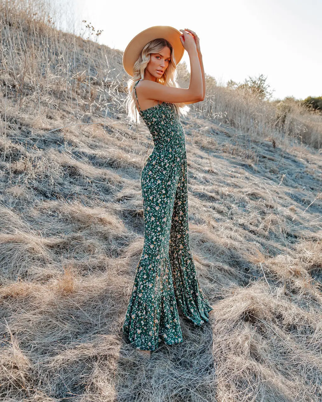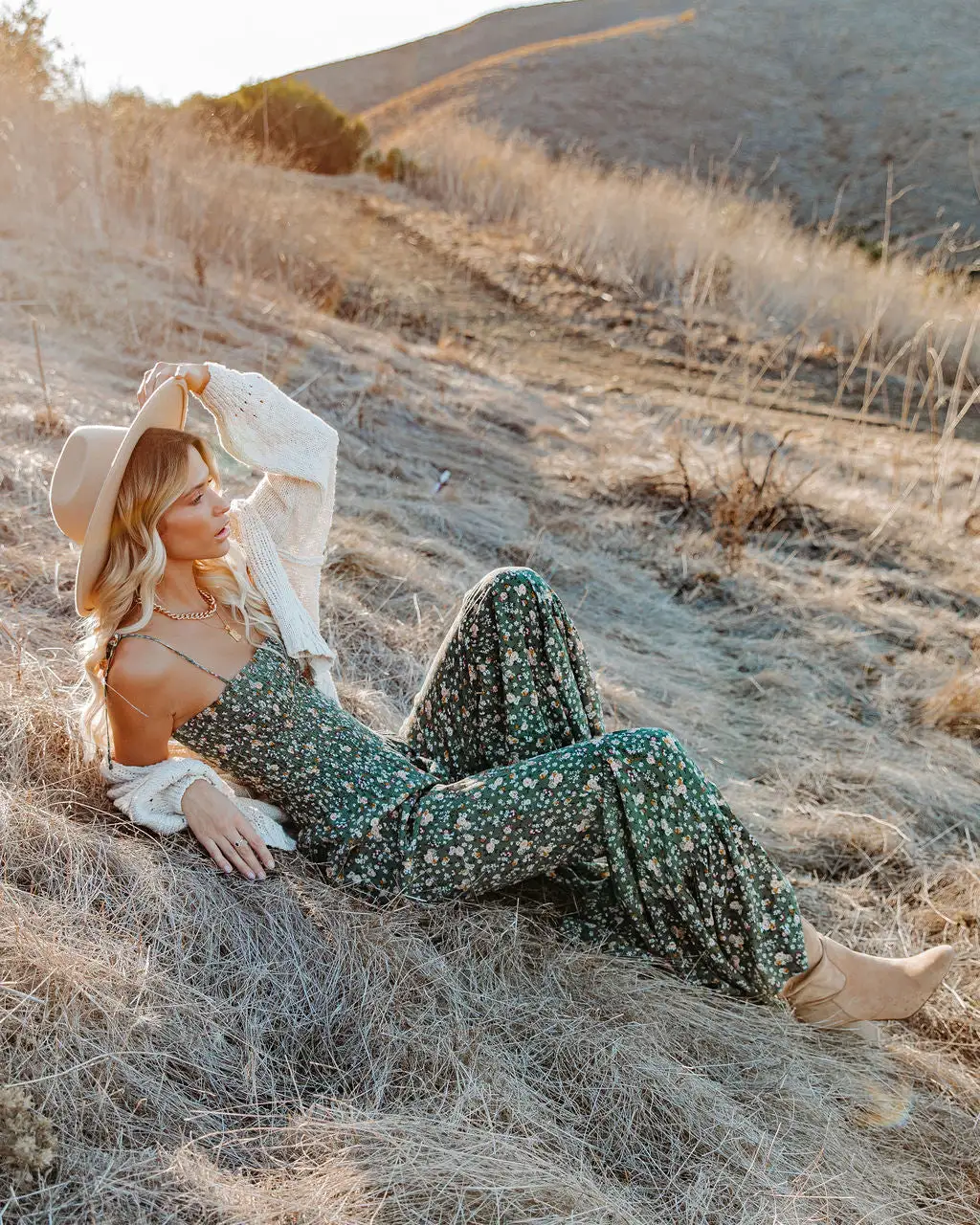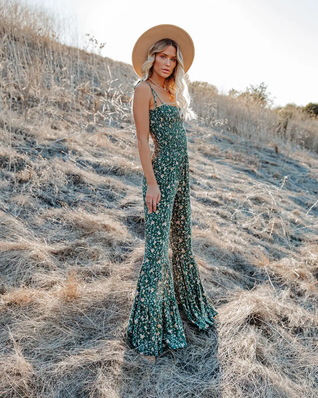 70’s vibes are high in our Felicity Floral Smocked Flared Leg Jumpsuit! This olive base jumpsuit displays florals in mustard, white, hunter green, plum, and grey throughout. Finished with a smocked bodice and adjustable tie spaghetti straps. Styled with the Aston Hat, Perfect Hoop Earrings, Mica Chain Choker, Initial Card Necklace, and Roma Cotton Blend Button Front Cardigan, Darby Heeled Slouch Bootie.