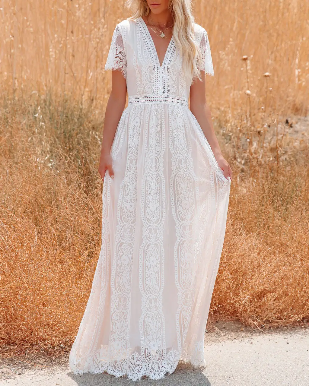 Soft eyelash lace trims the Fill Your Heart Lace Maxi Dress. Designed with a white lace overlay and tulle underlay. Cut with a v-neckline, short sleeves and a full bodied skirt. This piece fashions a sheer crochet waistband and soft scalloping for a romantic touch. Complete with full lining and a concealed back zipper. Pull your hair back for a summer white statement and/or bridal look! Styled with the Perfect Hoop Earrings, 5 Disc Choker, Chloe Mini Necklace, Compass Coin Necklace, Minimal Herringbone Necklace, Brand New Heeled Sandal.