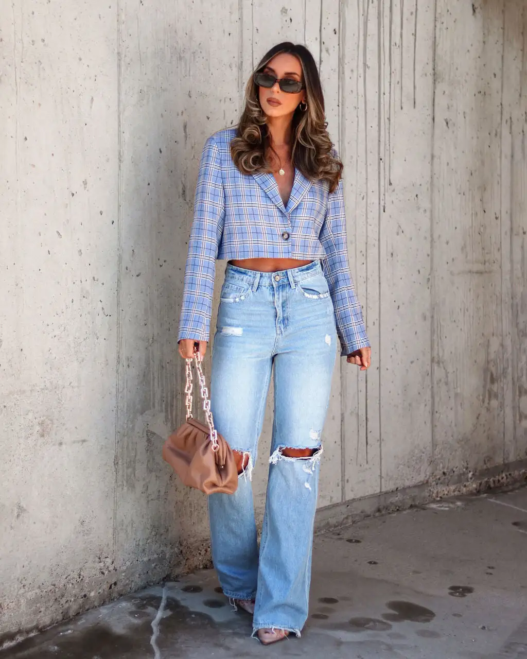 Major clueless vibes in the Find A Way Plaid Crop Blazer in blue that features padded shoulders.