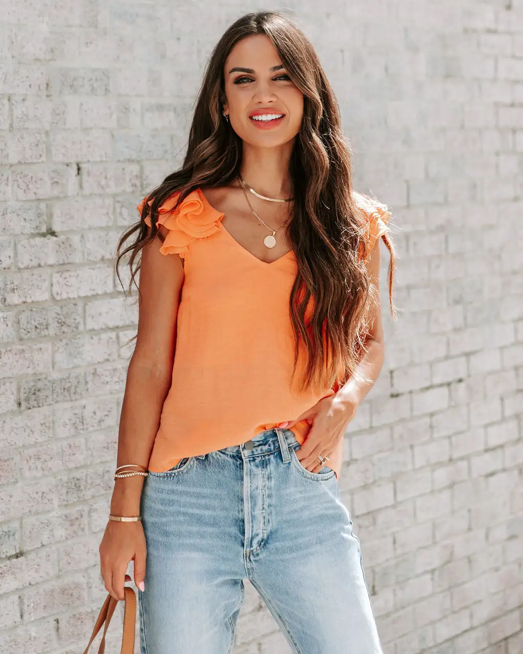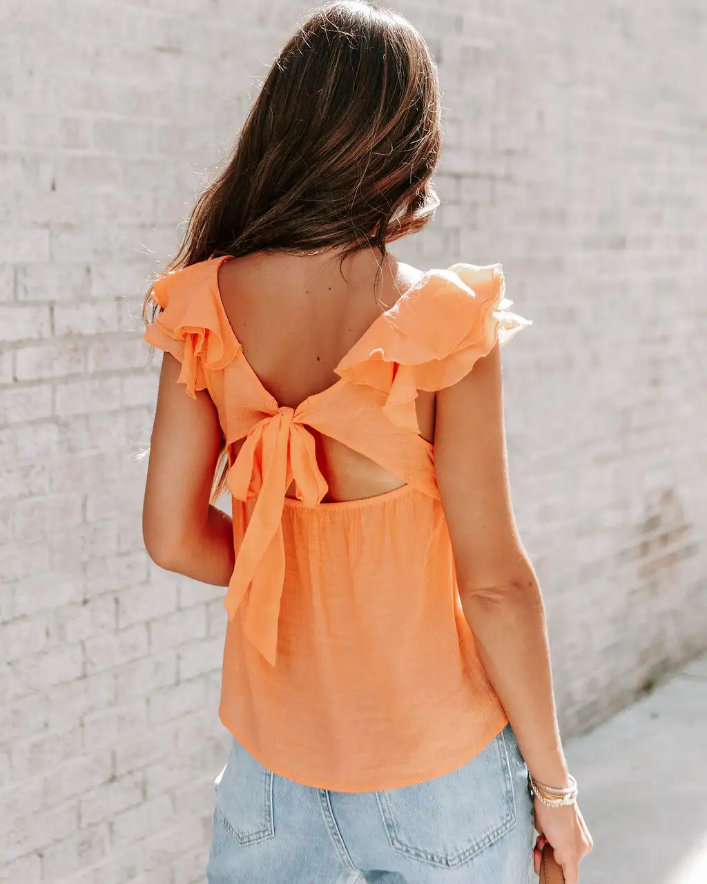 We’re crushing on the Fino Flutter Sleeve Top in orange that features a v-neckline and an open back.