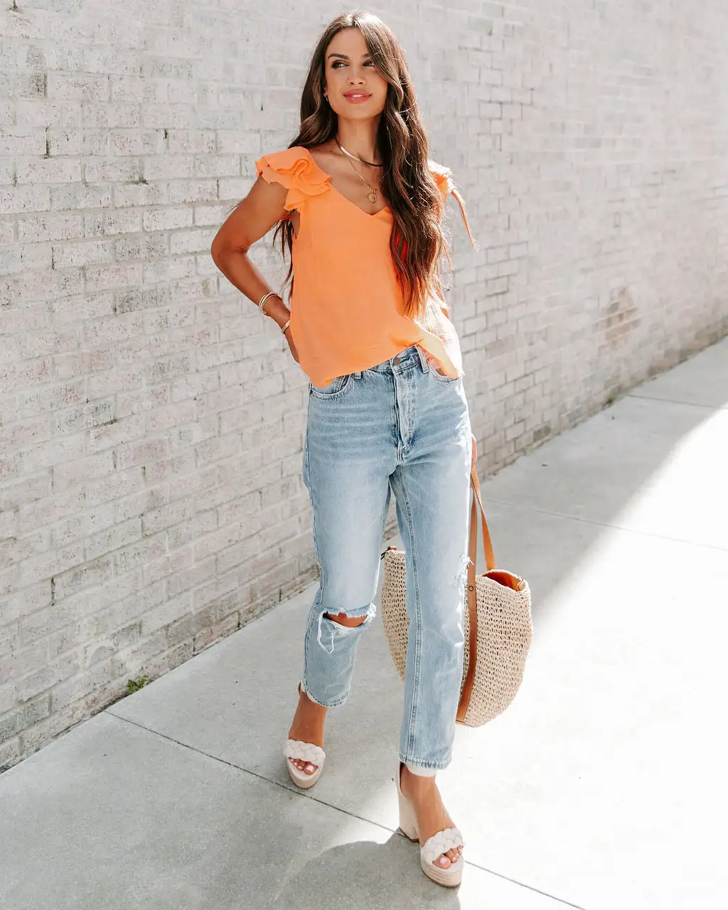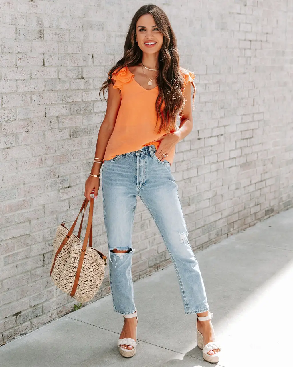 Styled with: Accent Herringbone Necklace, Kason Distressed Denim, Roccio Braided Platform Sandal, and Scottsdale Woven Tote Bag