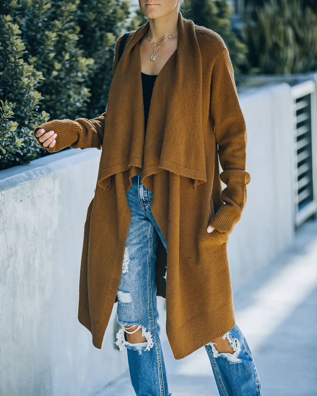 //Best Seller// New Color// Cozy up in our Fireside Pocketed Knit Cardigan! Designed with a draped lapel and side pockets. This cardigan is crafted in a luxe camel fabrication with ribbed sleeves. Styled with the Carson Black Frame Dark Smoke Polarized Sunglasses, Chloe Mini Necklace, Initial Card Necklace, Simple Bangle Bracelet, Chic Crossbody Chain Pouch Bag, Physique Racerback Tank, Jude Distressed Boyfriend Denim, and Jocelyn Heeled Bootie.