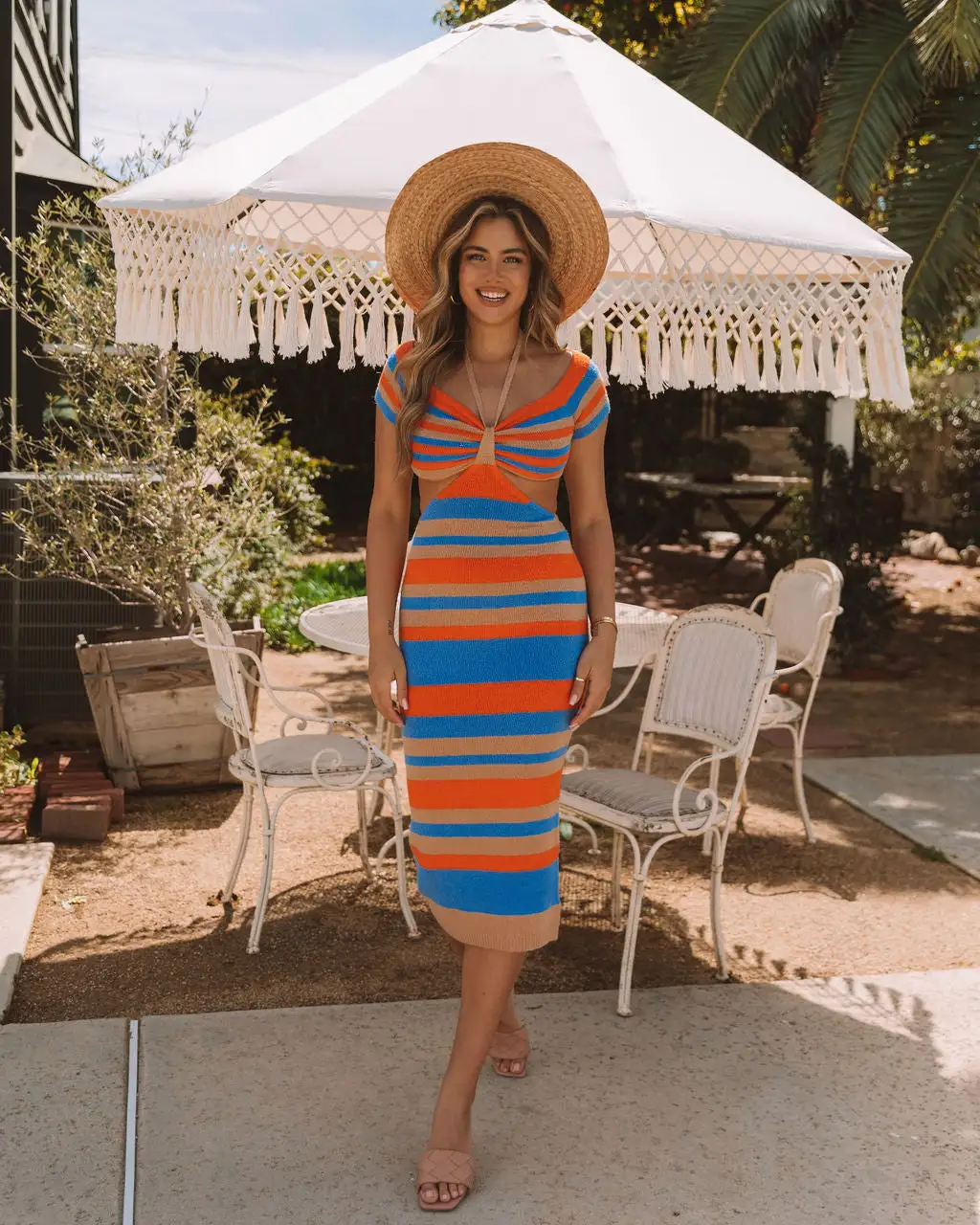 Model is Wearing a Size Medium. Height is 5’9″, Bust is 34.5”, Waist 28”, and Hips 41”