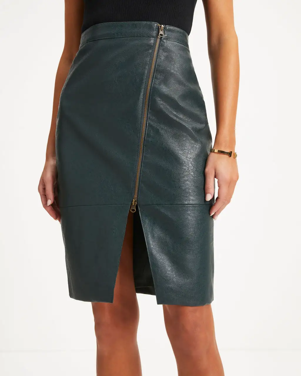 Edgy babes will love the Roxanne Asymmetrical Faux Leather Mini Skirt in forest green that features a structured waistband.