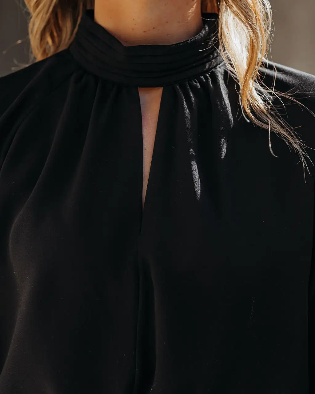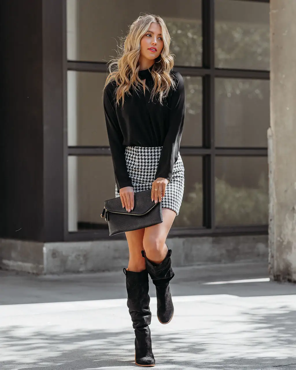 Our Atlas Keyhole Bodysuit is such a chic event look with faux leather pants! This black bodysuit features a billowy fit and a high neckline. Finished with back button and snap closures. Styled with the Perfect Hoop Earrings, Stella Crossbody Envelope Zip Clutch, Kimberly Houndstooth Mini Skirt, and Saint Slouch Boot.