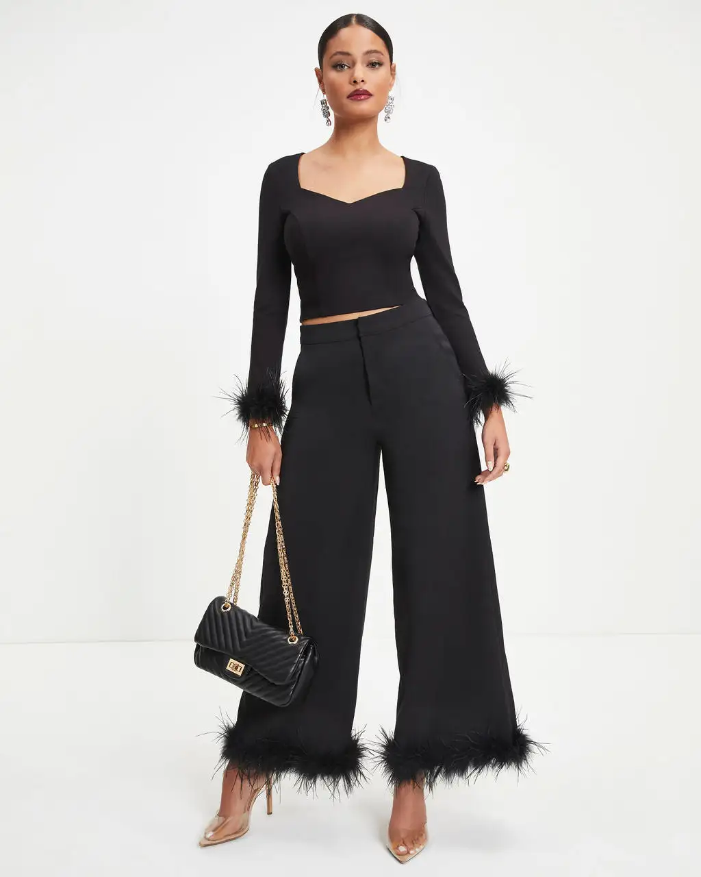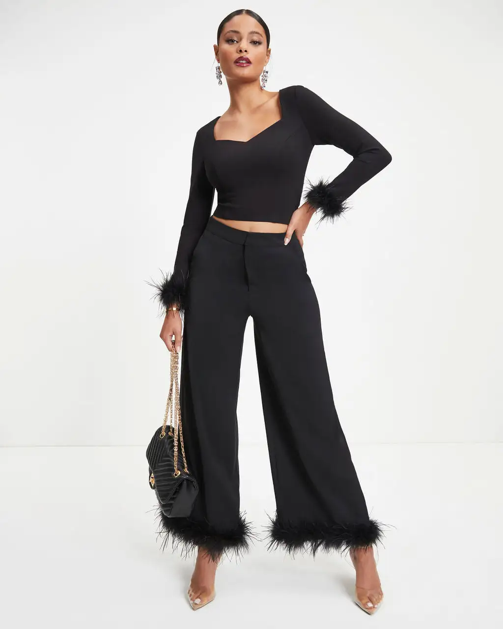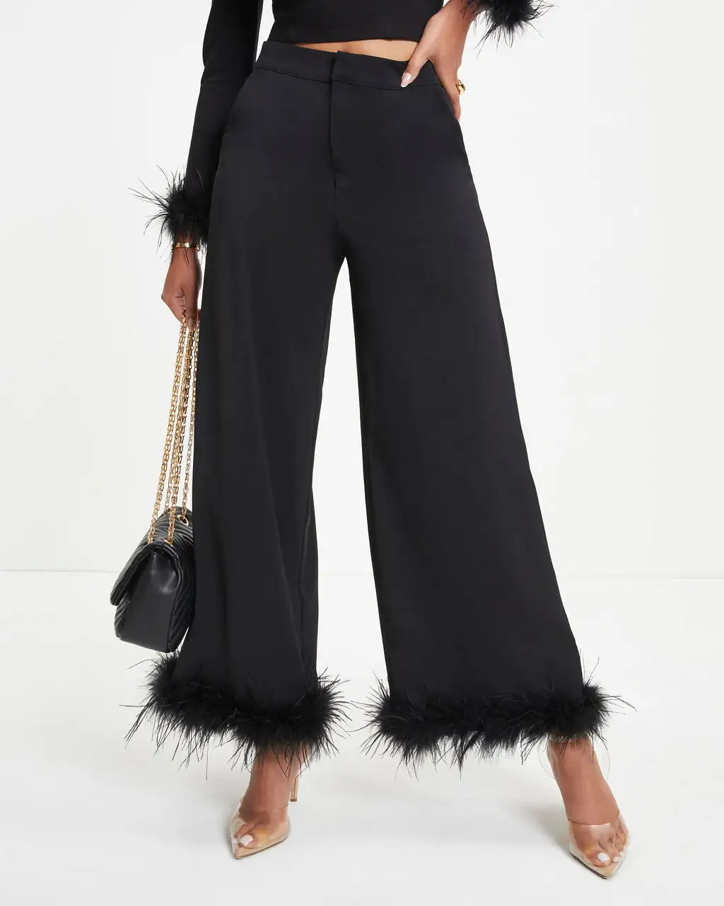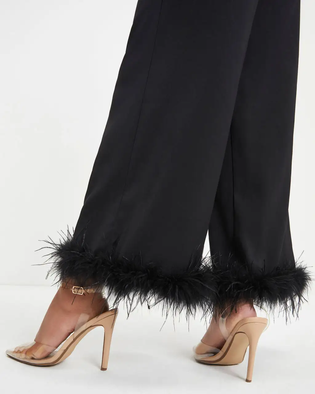 Festive meets femme in the New Lover Feather Trim Pocketed Pants in black that feature a feather trimmer.