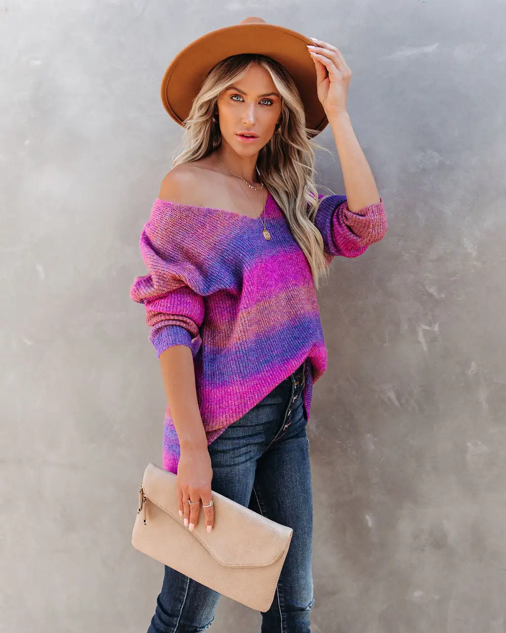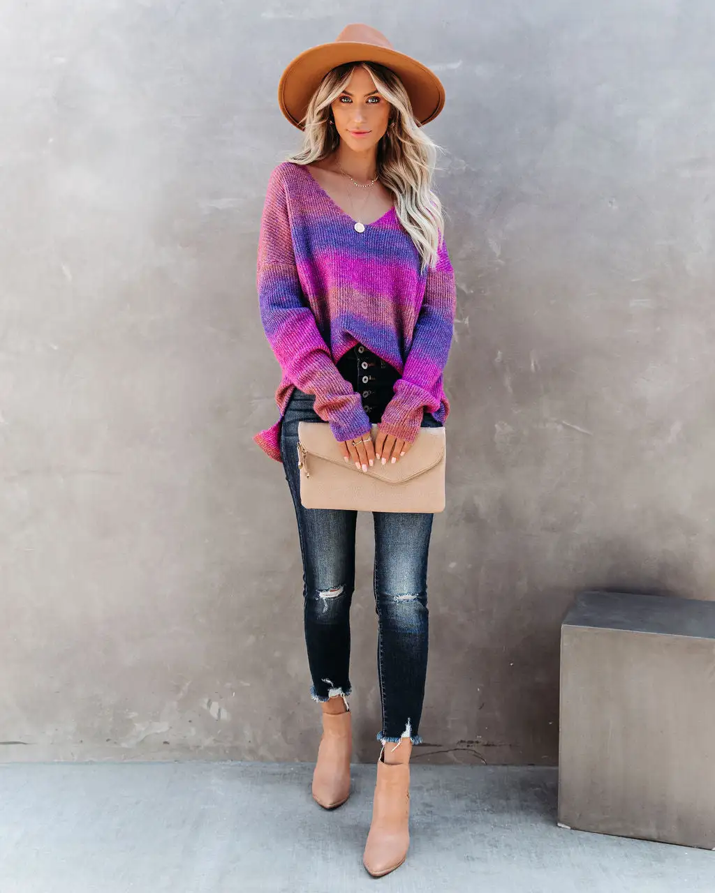 //VICI Exclusive// Our Generous Heart Ombre Knit Sweater will keep you warm all season long! Magenta, rust, and purple ombre hues make up this top. Designed with a rounded neckline and side slits. Styled with the Rocky Mountain Hat, Mercury Hoops, Chloe Mini Necklace, The Buddha Wheel Necklace, Stella Crossbody Envelope Zip Clutch, Tilley Frayed Ankle High Waisted Skinny, and Finley Faux Leather Bootie.