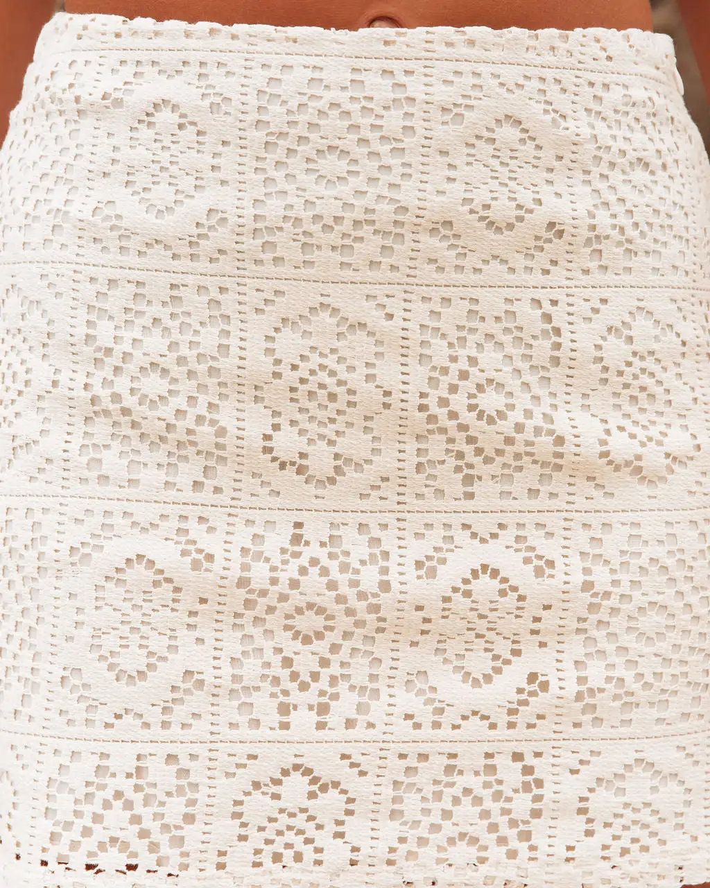 Resort ready, the Kylie Cotton Crochet Mini Skirt in cream that features a structured waistband.