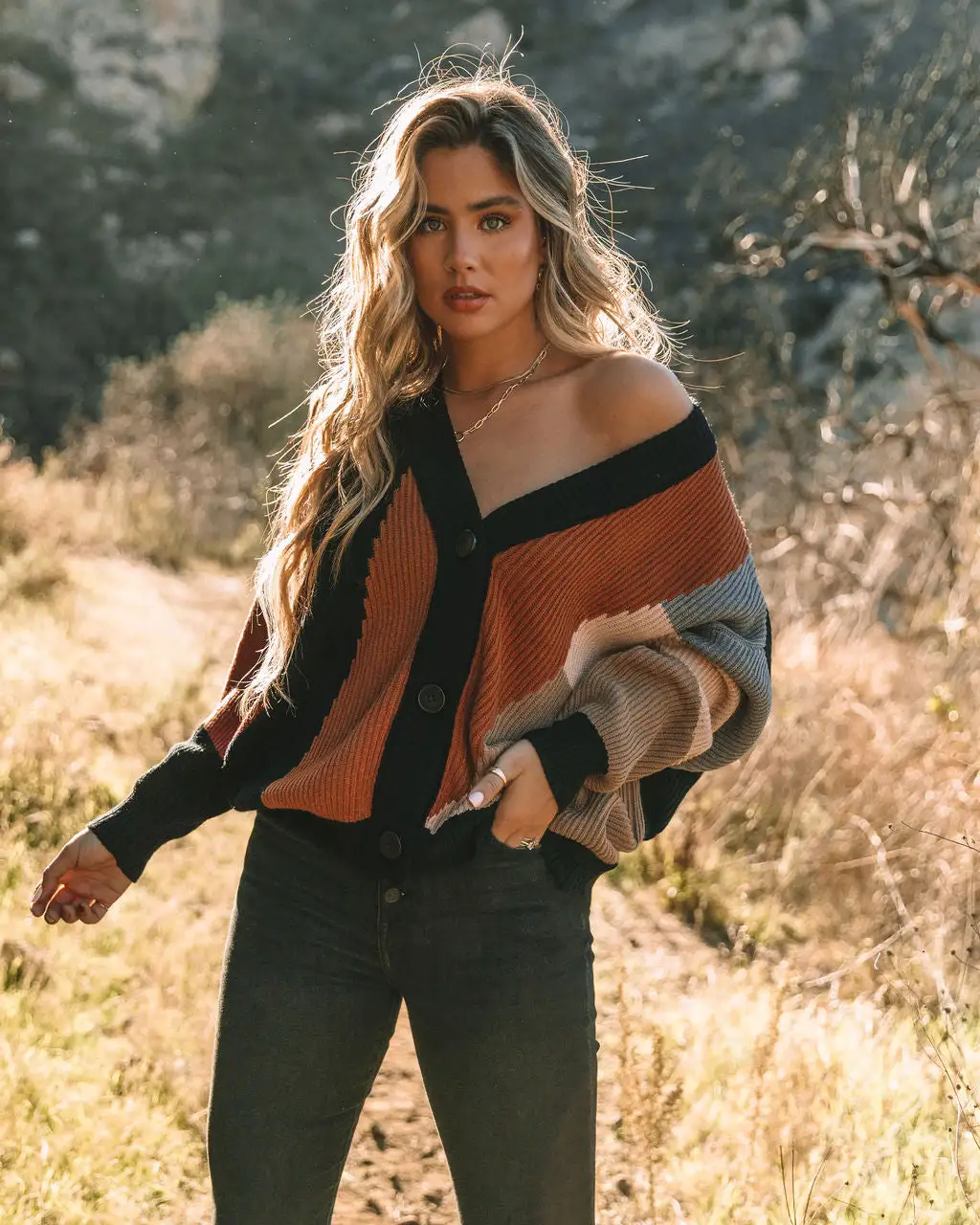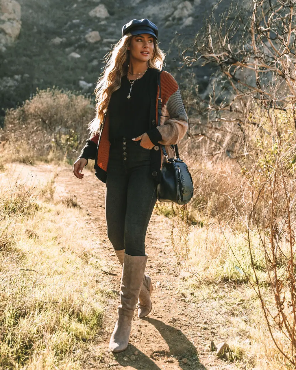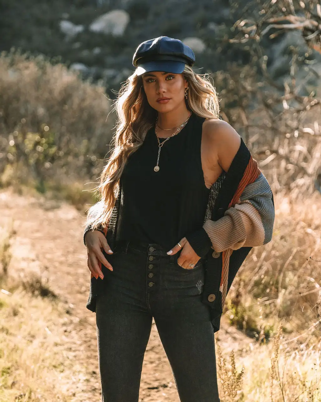 Our Glee Button Front Colorblock Cardigan is so unique! Black, camel, beige, blue, and olive colorblock hues detail this top. Designed with front button closures and ribbed edges. Styled with the Nolita Faux Leather Cap, Ana Gold Coin Lariat, Minimal Herringbone Necklace, Highland Bag, Physique Racerback Tank, Keen High Rise Button Front Skinny, and Saint Slouch Boot.