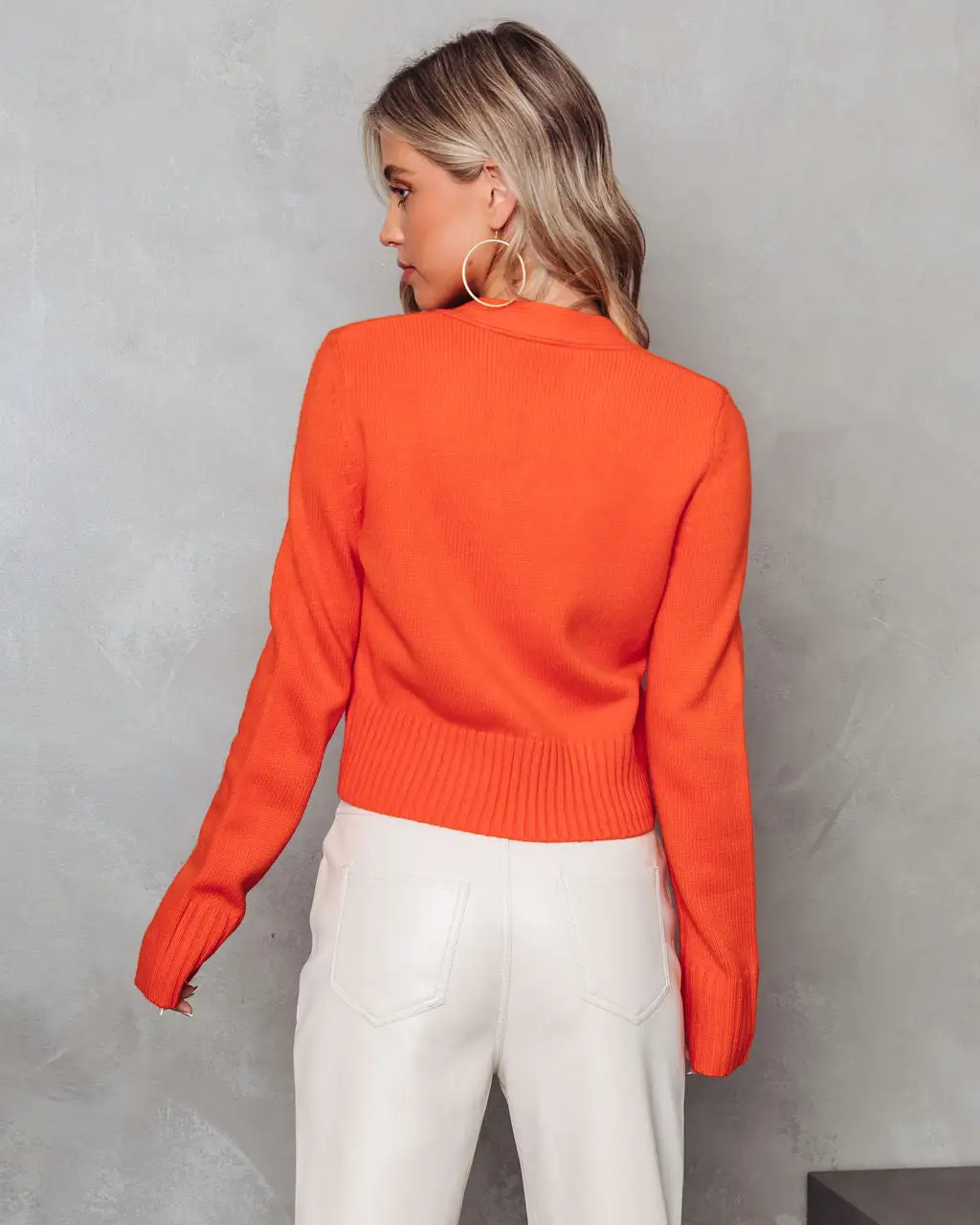 Cozy meets cute in the Golden Hearts Cropped Cardigan in orange that features a relaxed fit.
