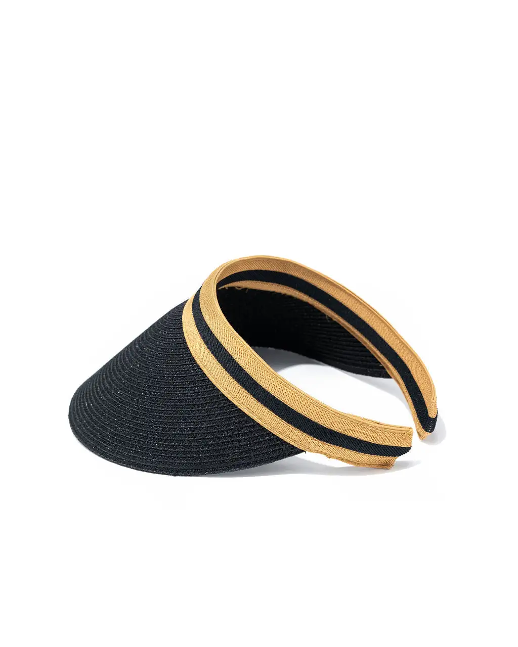 Block out the sun in the Golden Hour Straw Visor in black that features tan and gold shimmery hues and an adjustable fabric band.