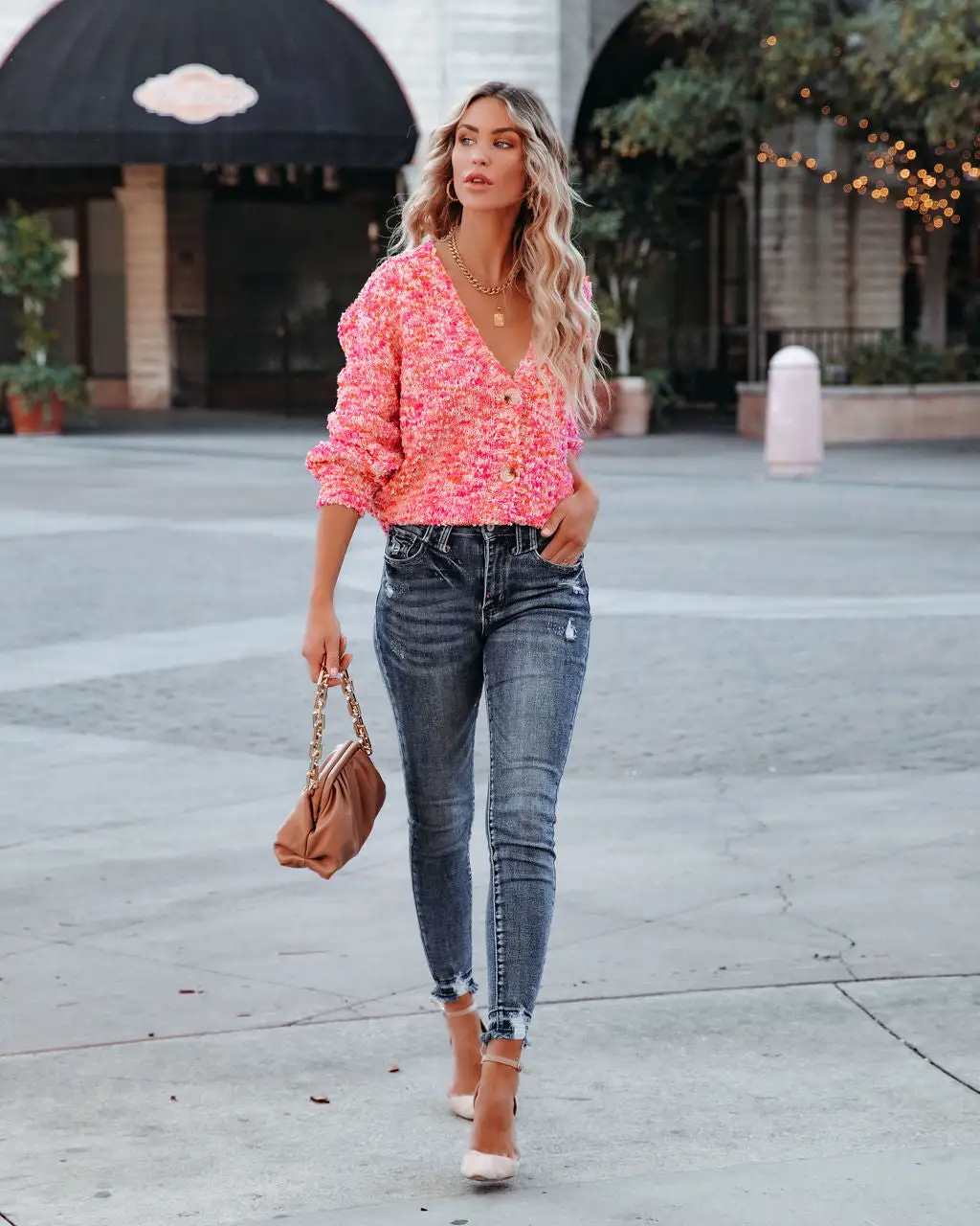 //Best Seller// New Color// You’ll always be smiling while wearing our Good Mood Button Front Crop Knit Cardigan! This pink, red, and blush multi knit cardi has a v-neckline and front button closures. Styled with the Chance Hoops, Mica Chain Choker, Initial Card Necklace, Chic Crossbody Chain Pouch Bag, Ginny High Rise Distressed Skinny, and Ritz Faux Suede Pointed Heel.