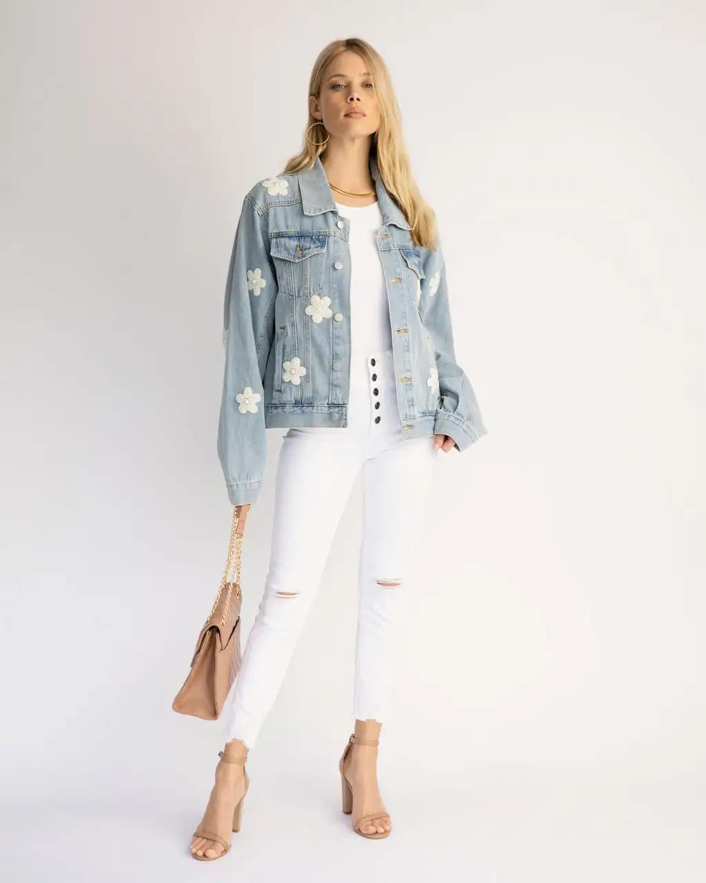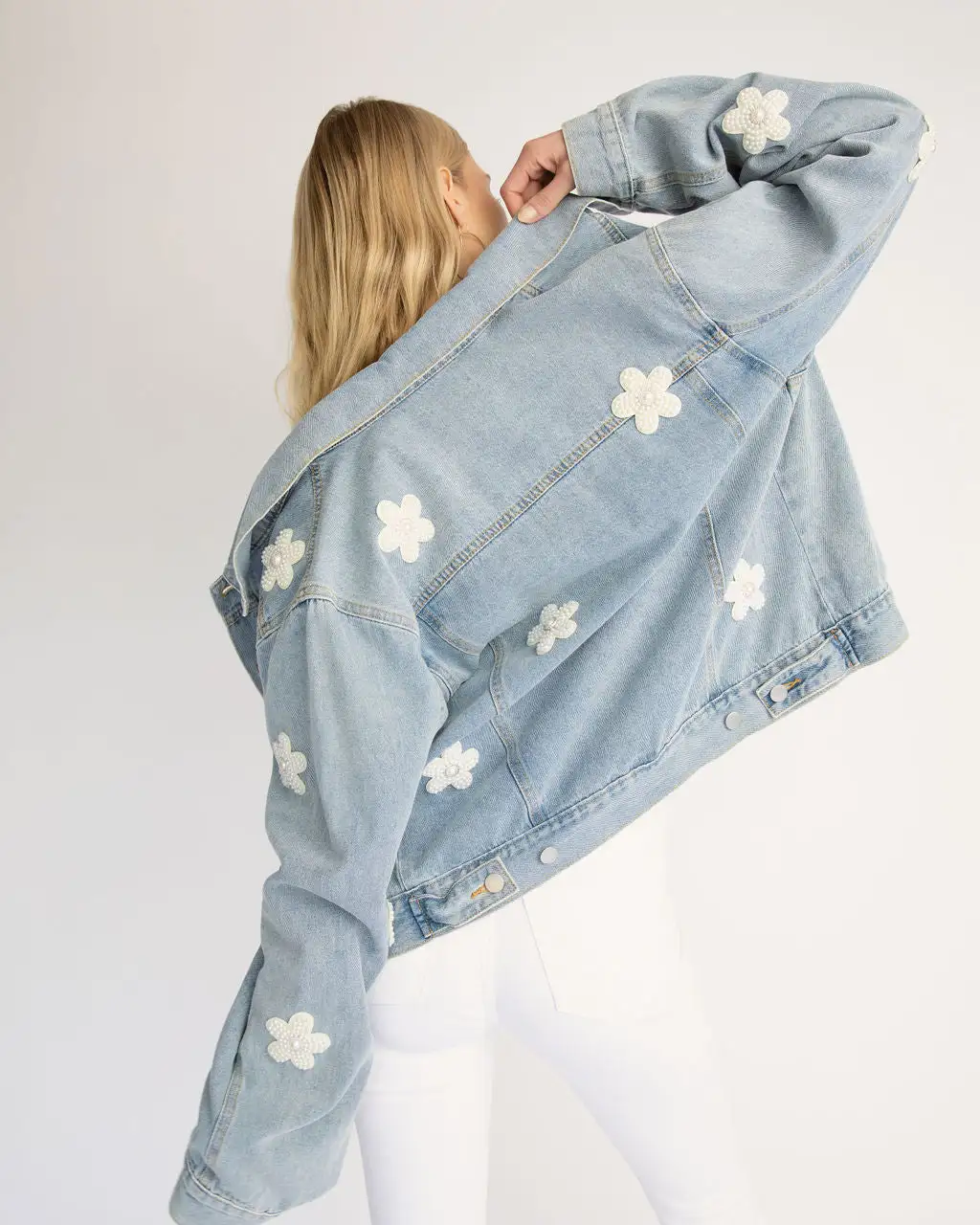 Add a layer of fun in the Gracie Embellished Floral Pearl Pocketed Denim Jacket in light wash that features an oversized fit.