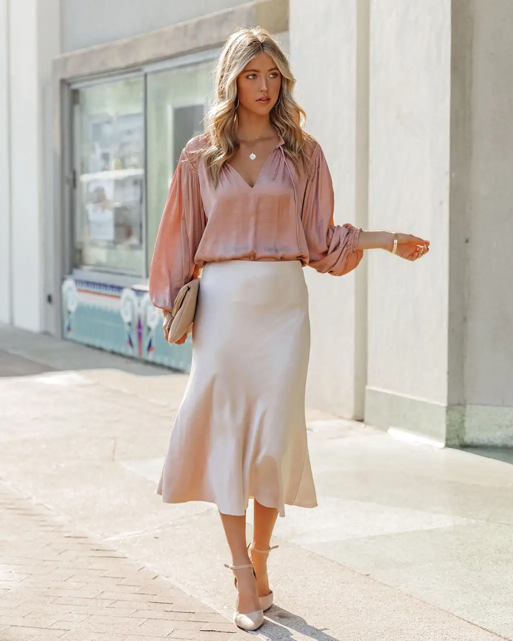 Silk skirts look so chic in the office! Our Shawn Satin Midi Skirt comes in a lustrous champagne hue. Designs with an elastic waistband and no closures. Wear this midi with a collared blouse and heels. Styled with the Perfect Hoop Earrings, 5 Disc Choker, Chloe Mini Necklace, Gaia Coin Necklace, Simple Bangle Bracelet, Commitment Satin Blouse, Stella Crossbody Envelope Zip Clutch, and Ritz Faux Suede Pointed Heel.