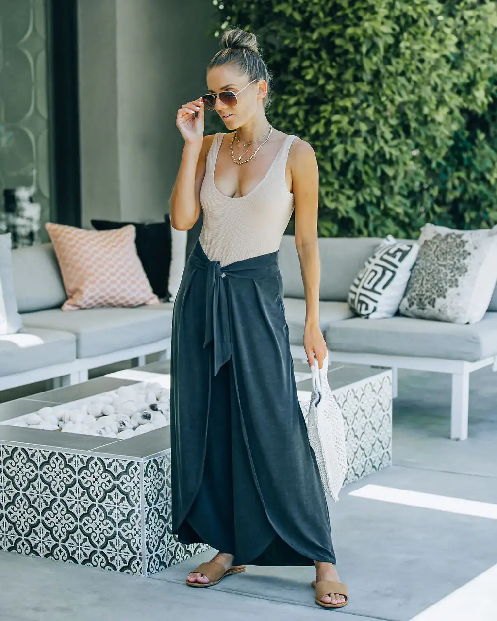 Styled with: 5 Disc Choker, Moxie Simple Chain Necklace, Mili Droplet Necklace, Bermuda Bag, Bronzed One Piece, and Airway Sandal.