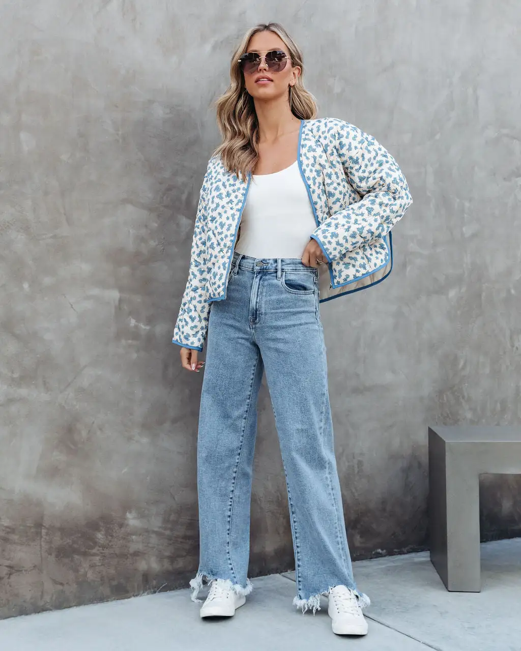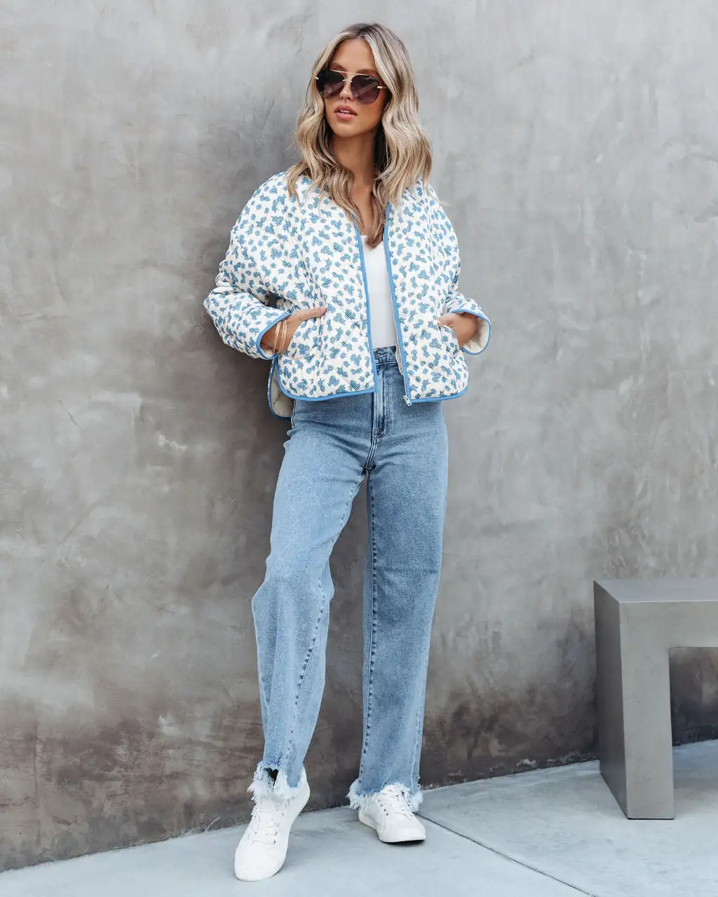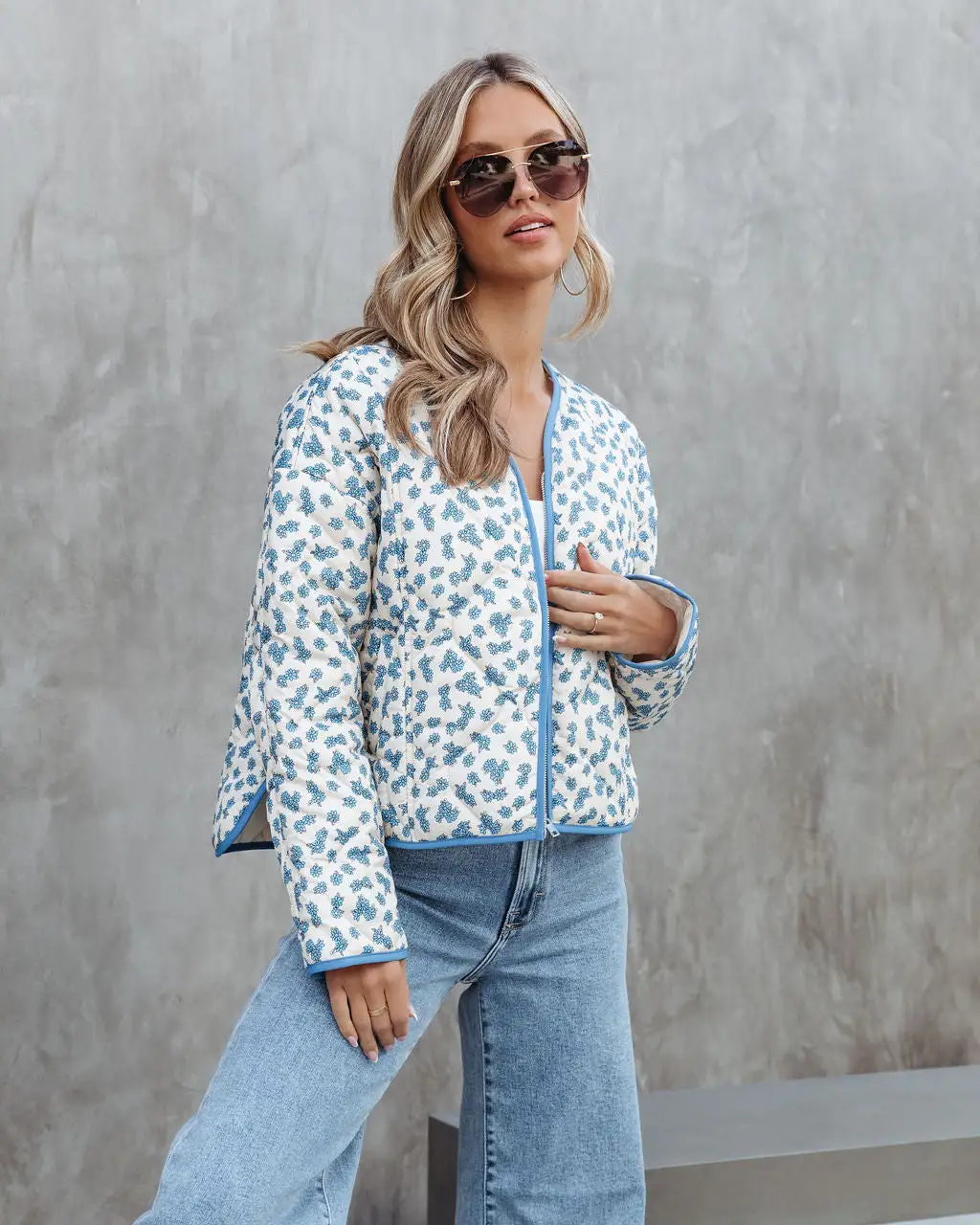 Comfy meets cute in the Gwen Floral Quilted Pocketed Jacket in cream blue that features an oversized fit.