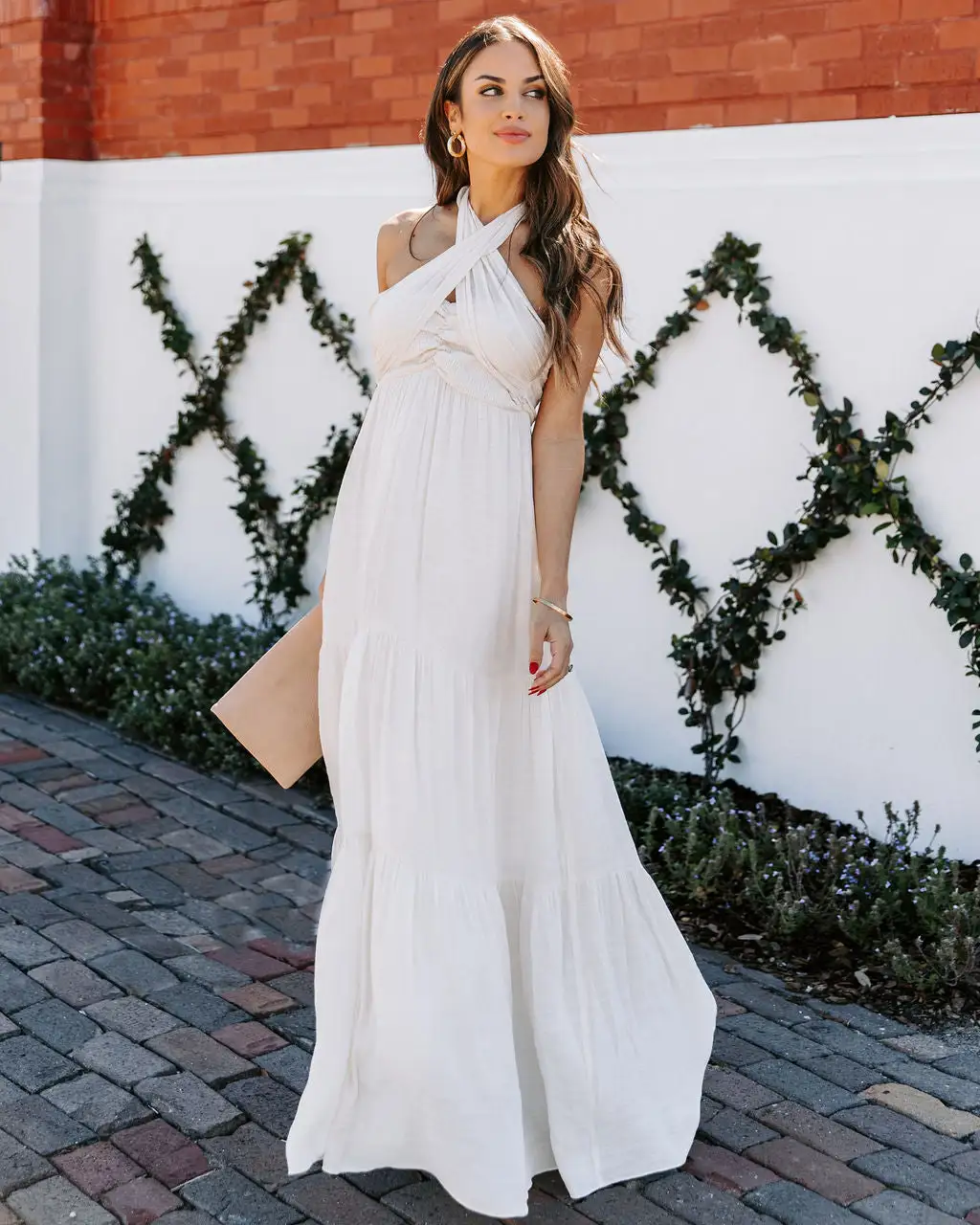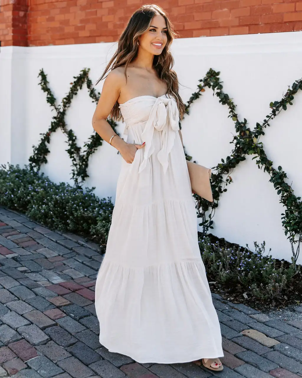 //VICI Exclusive// Spring events are what our Hattie Strapless Pocketed Tie Front Maxi Dress is made for in a bamboo cream hue that features a fit and flare silhouette.