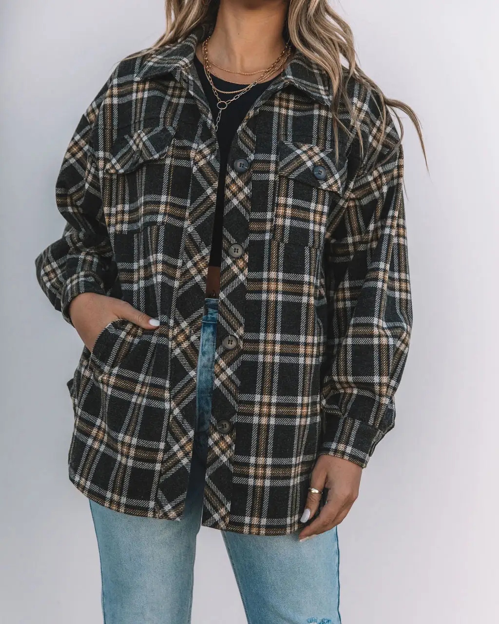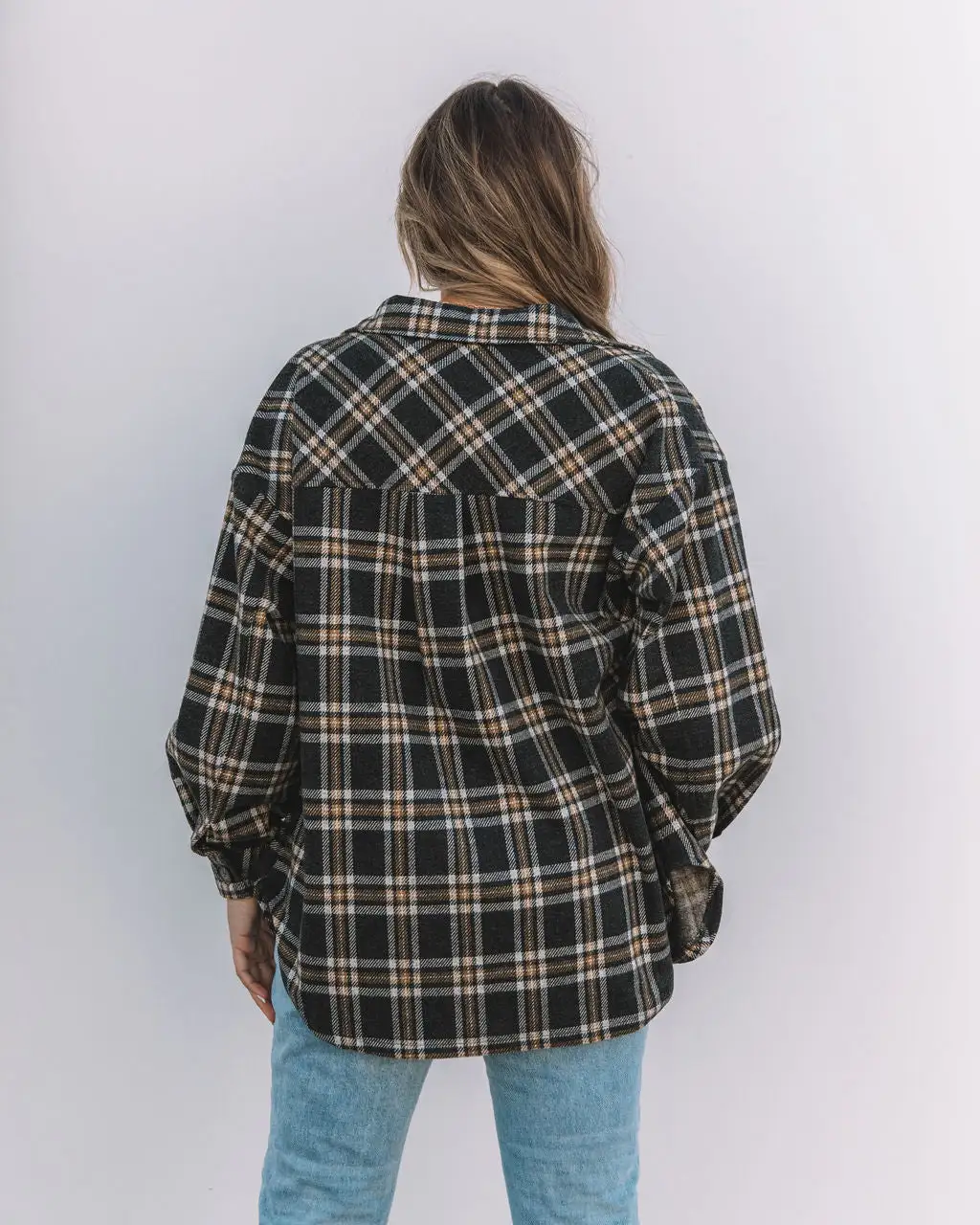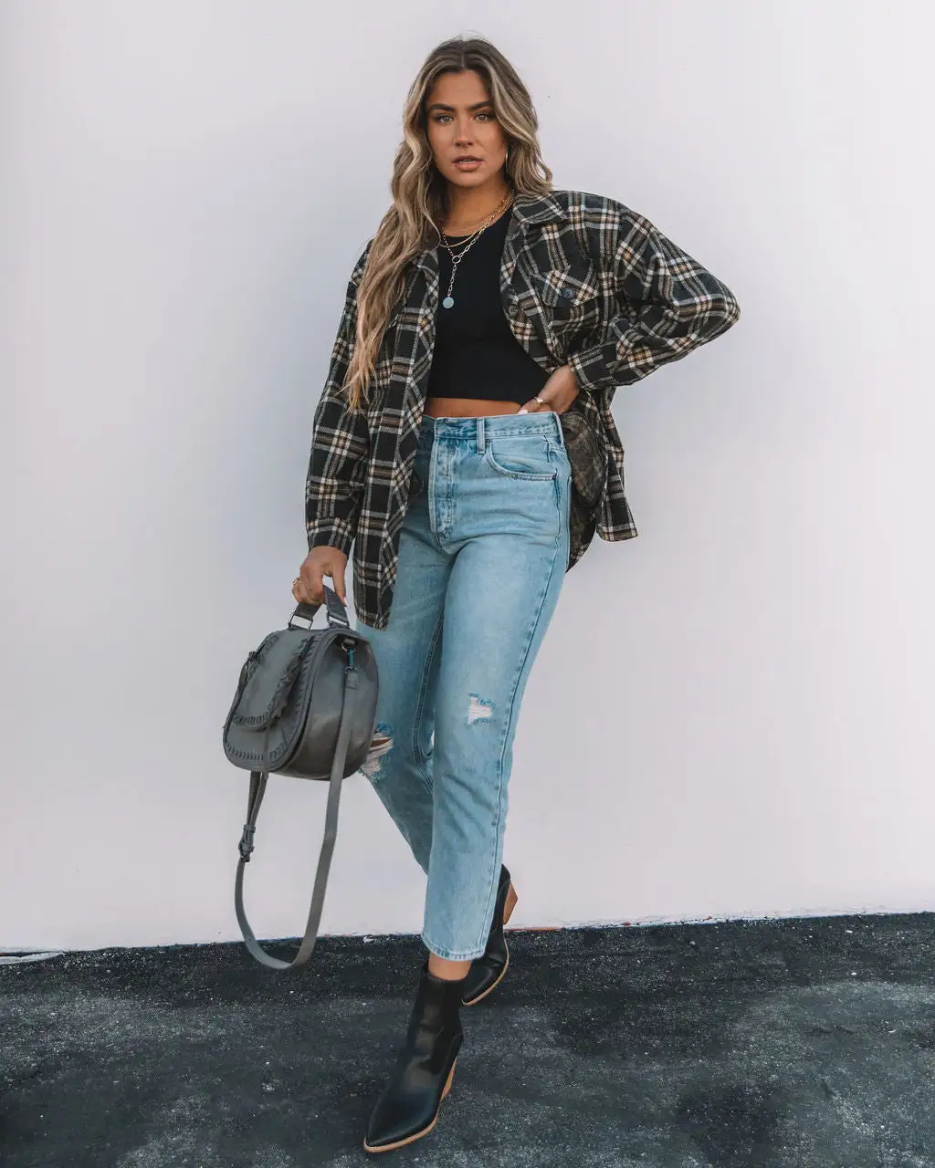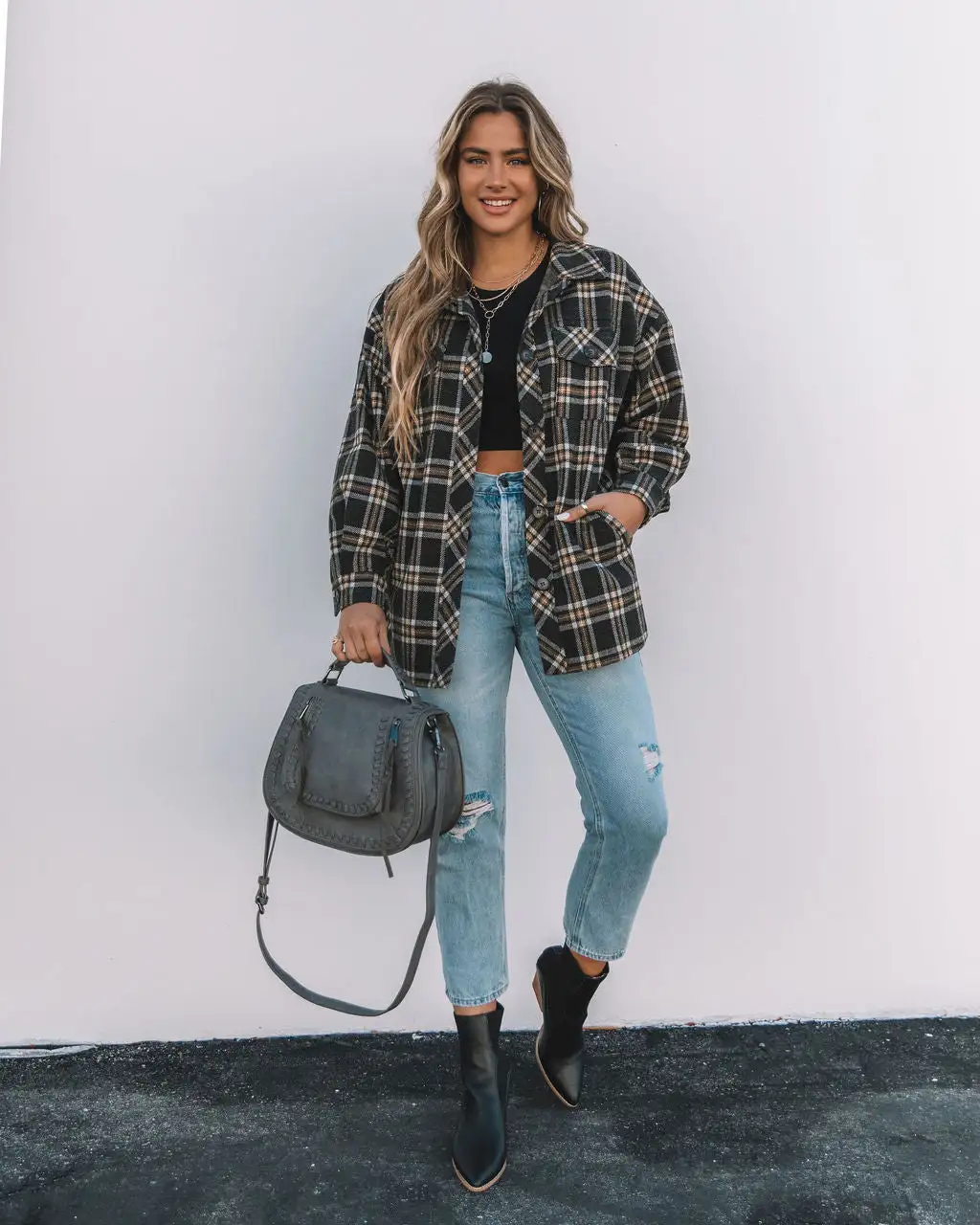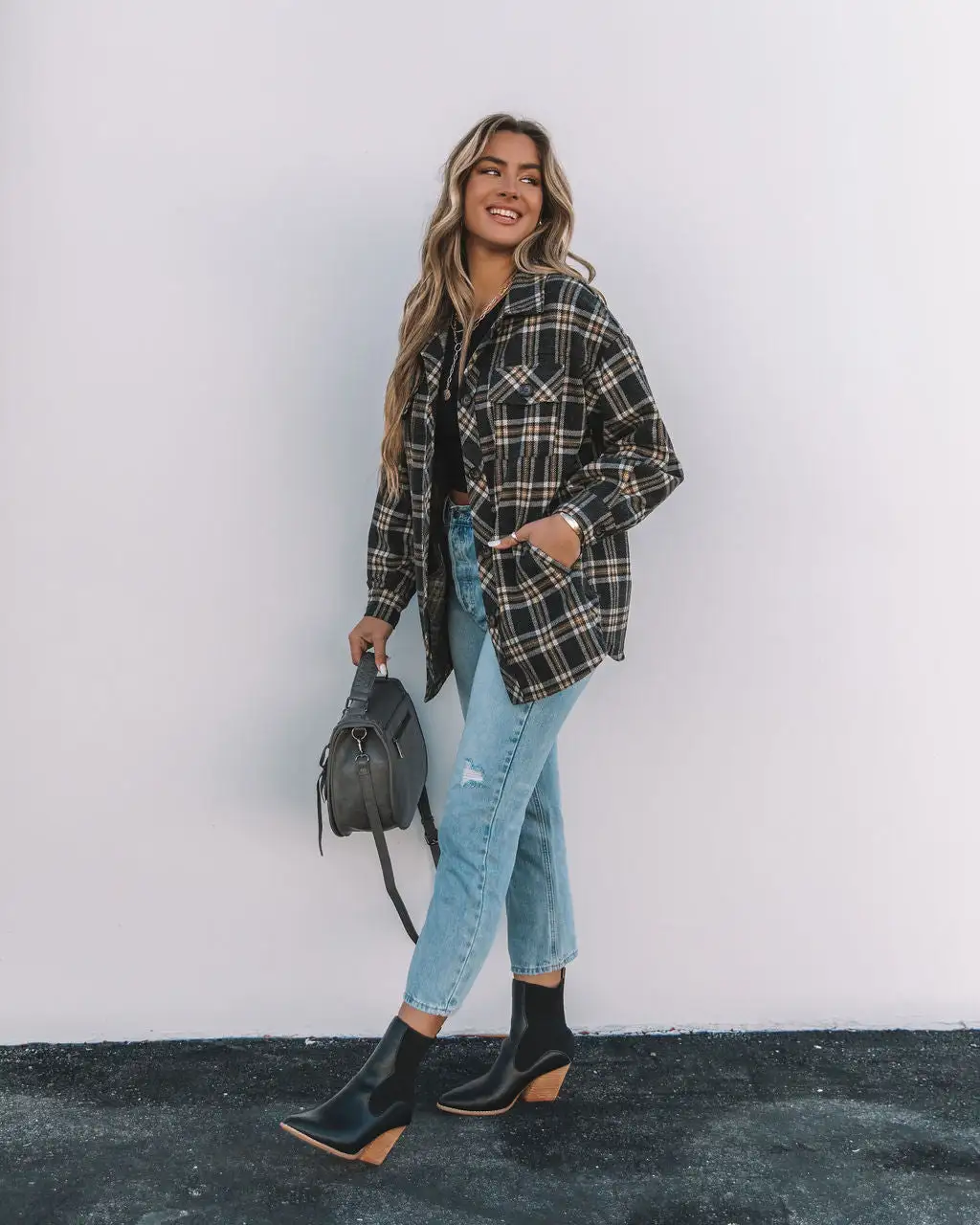 Throw on our Hearst Pocketed Plaid Button Down Shacket over everything you own! This charcoal, camel, and off white plaid shacket features front button closures. Designed with a collar and long sleeves. Styled with the Perfect Hoop Earrings, Ana Gold Coin Lariat, Layers Of My Heart Necklace, Highland Bag, Kiki Knit Crop Top, Kason Distressed High Rise Denim, and Jocelyn Heeled Bootie.