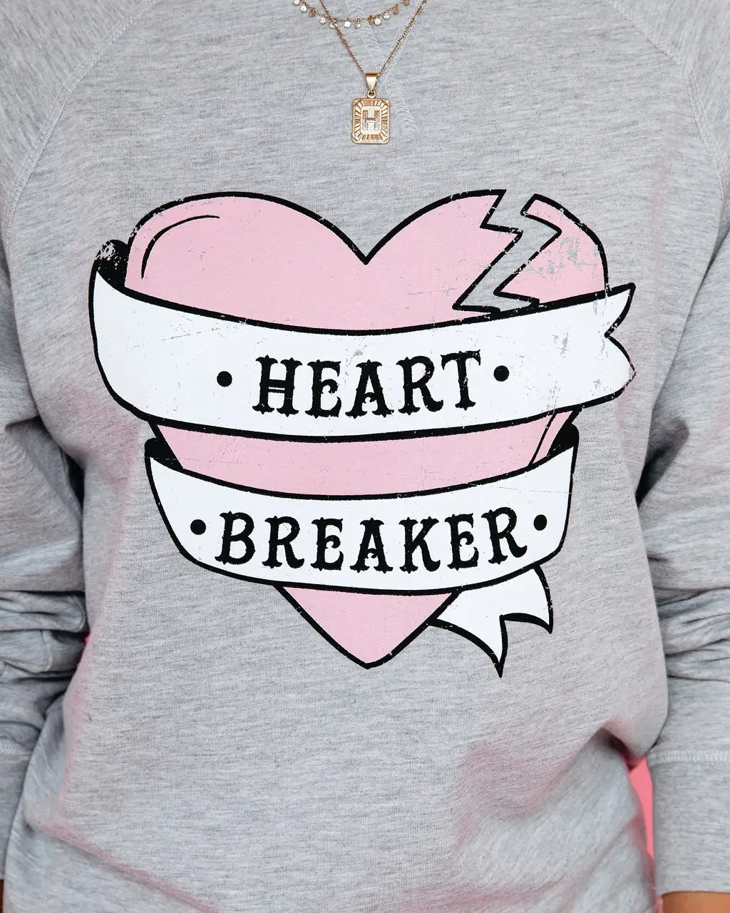 Our Heartbreaker Cotton Blend Raglan Pullover is so cheeky! This heather grey pullover features pink, white, and black hues. Designed with ribbed edges and a crew neckline. Styled with the Perfect Hoop Earrings, Chloe Mini Necklace, Initial Card Necklace, Mcguire High Rise Distressed Denim, and Common Thread Sneaker.
