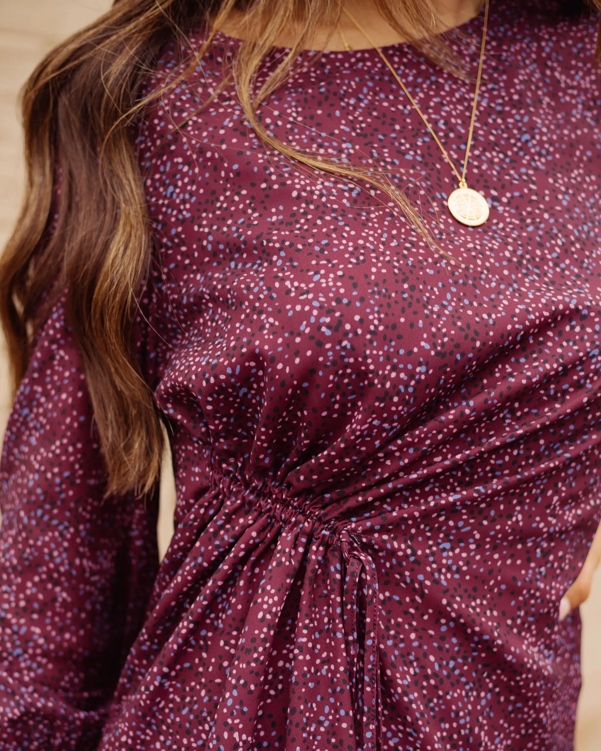Feel ultra femme in the Love Takes Time Printed Ruched Dress! This super sweet burgundy colored long sleeve dress features a spotted print in sky blue, blush, and black. The crew neck, elastic hems, and side ruching with a tie deliver just the right amount of detail. Finished with a back button closure. Styled with the El Dorado Hat, The Buddha Wheel Necklace, Chloe Mini Necklace, Stella Crossbody Envelope Zip Clutch, and Saint Slouch Boot.