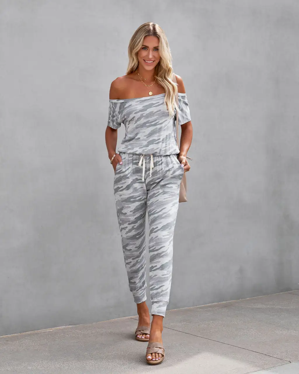 Our Hidden Treasure Pocketed Camo Knit Jumpsuit features a relaxed and loungy vibe! Feel like you tried when you walk outside in this camo print in shades of grey on a jersey knit.