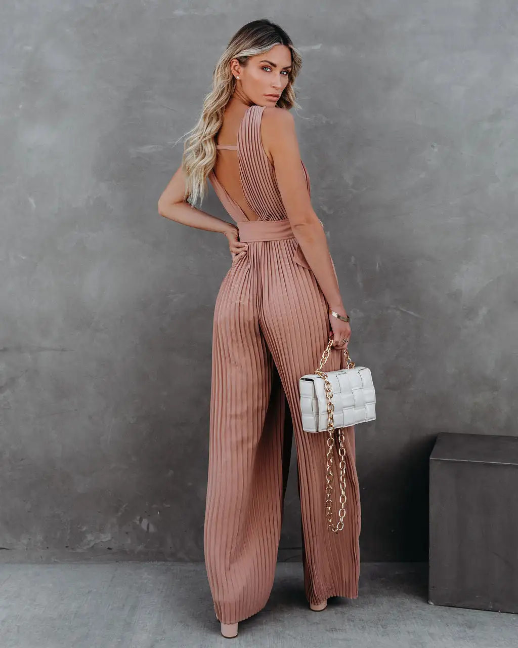 //Best Seller// New Color// Be the best guest dressed at any event in our High Tea Pleated Wide Leg Belted Jumpsuit! This mocha pleated jumpsuit has a wide leg and a draped neckline. The structured waist features an adjustable belt. Styled with the Chloe Mini Necklace, The Buddha Wheel Necklace, Simple Bangle Bracelet, Desire Padded Woven Chain Handbag, and Formal Faux Suede Heel.
