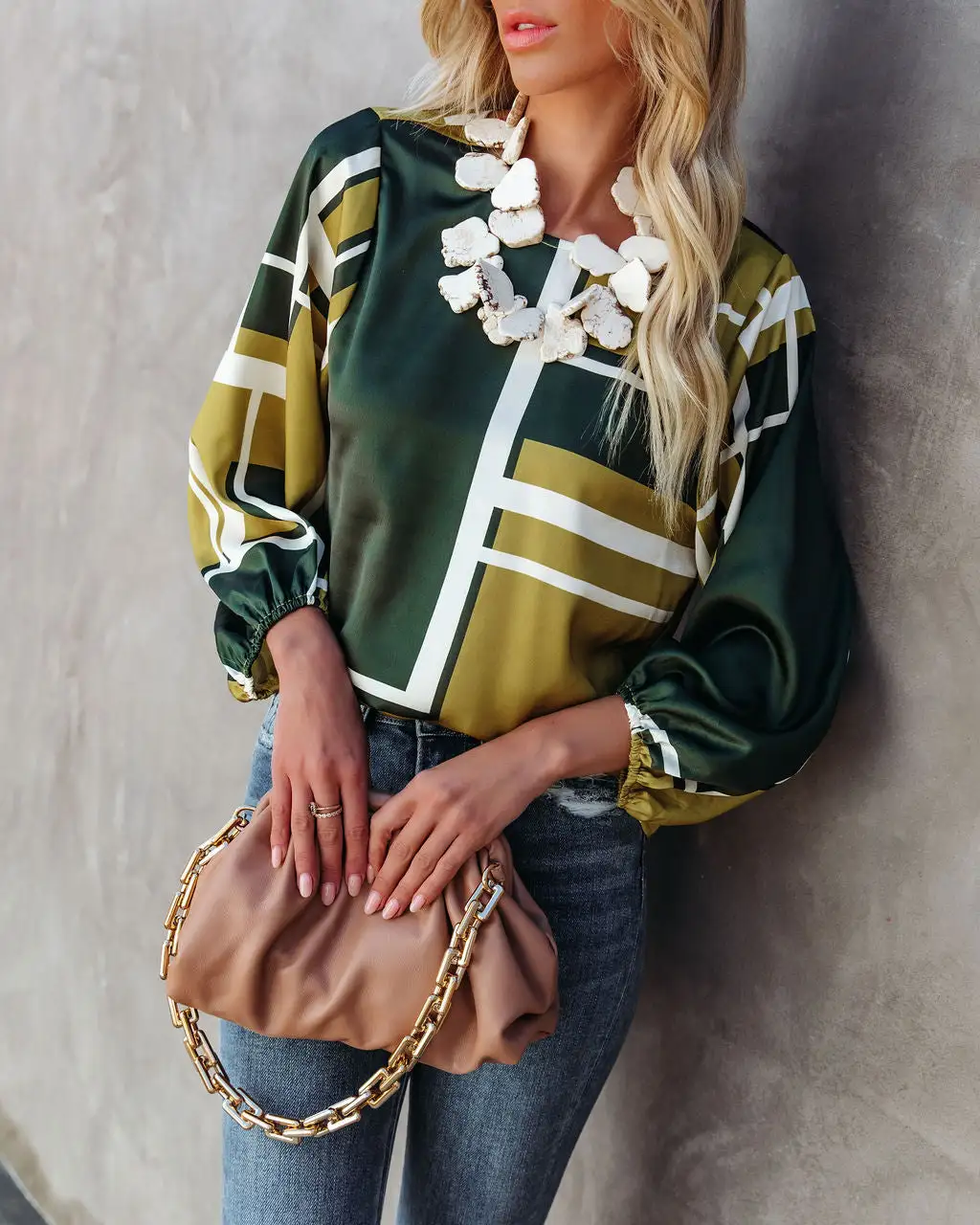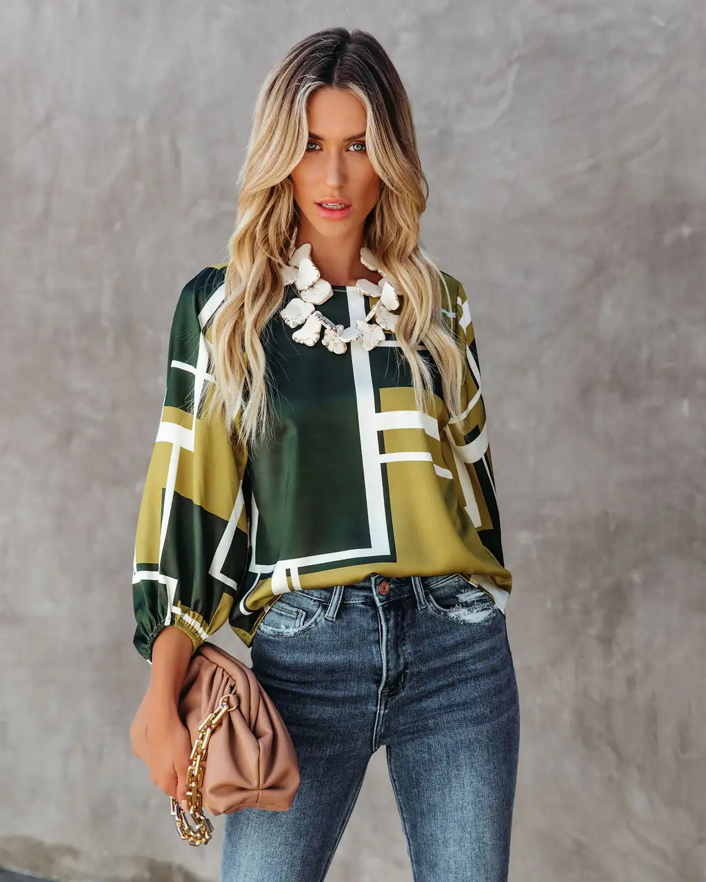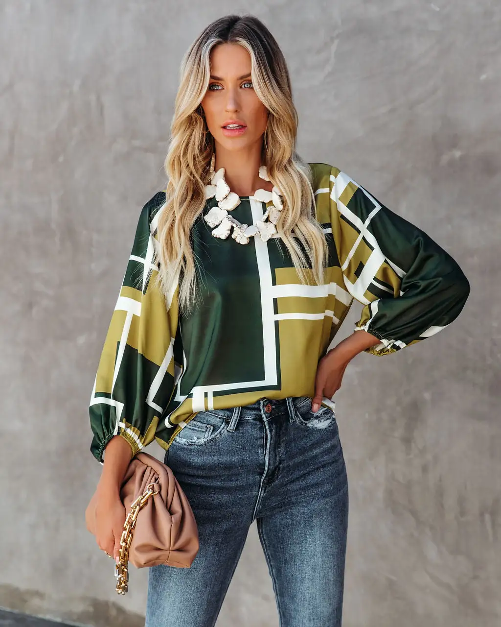 Our Idra Printed Satin Blouse will cue up some compliments! Hunter green, yellow, and off white hues detail this top. Crafted with a crew neckline and ¾ sleeves. Secured with a back button closure. Styled with the Tahiti Hoops, Slab Collar Necklace, Chic Crossbody Chain Pouch Bag, Benji High Rise Slim Straight Denim, and Ritz Faux Suede Pointed Heel.