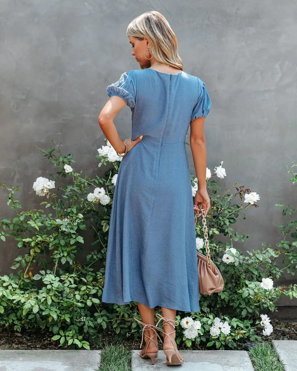 Transition easily from summer to fall in our Samantha Puff Sleeve Midi Dress! This dusty blue crepey midi is detailed with a v-neckline and a front o ring. Secured with a back zipper closure. Styled with the Perfect Hoop Earrings, Shayne Gold Link Necklace, Chloe Mini Necklace, Compass Coin Necklace, Simple Bangle Bracelet, Chic Crossbody Chain Pouch Bag, and Bella Faux Leather Strappy Kitten Heel.