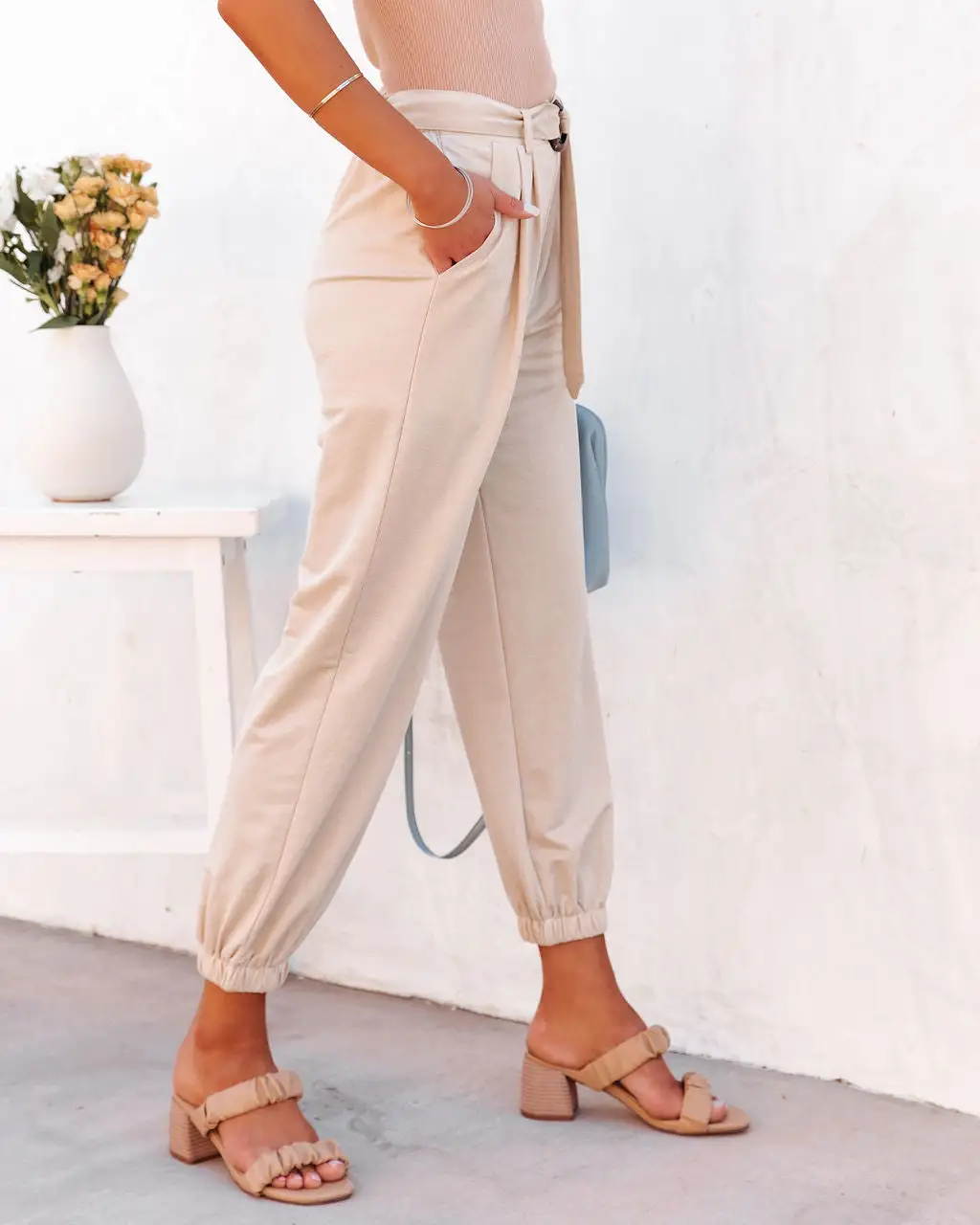 Stroll around in style in the Ilana High Rise Pocketed Belted Trousers in champagne that are detailed with side pockets.