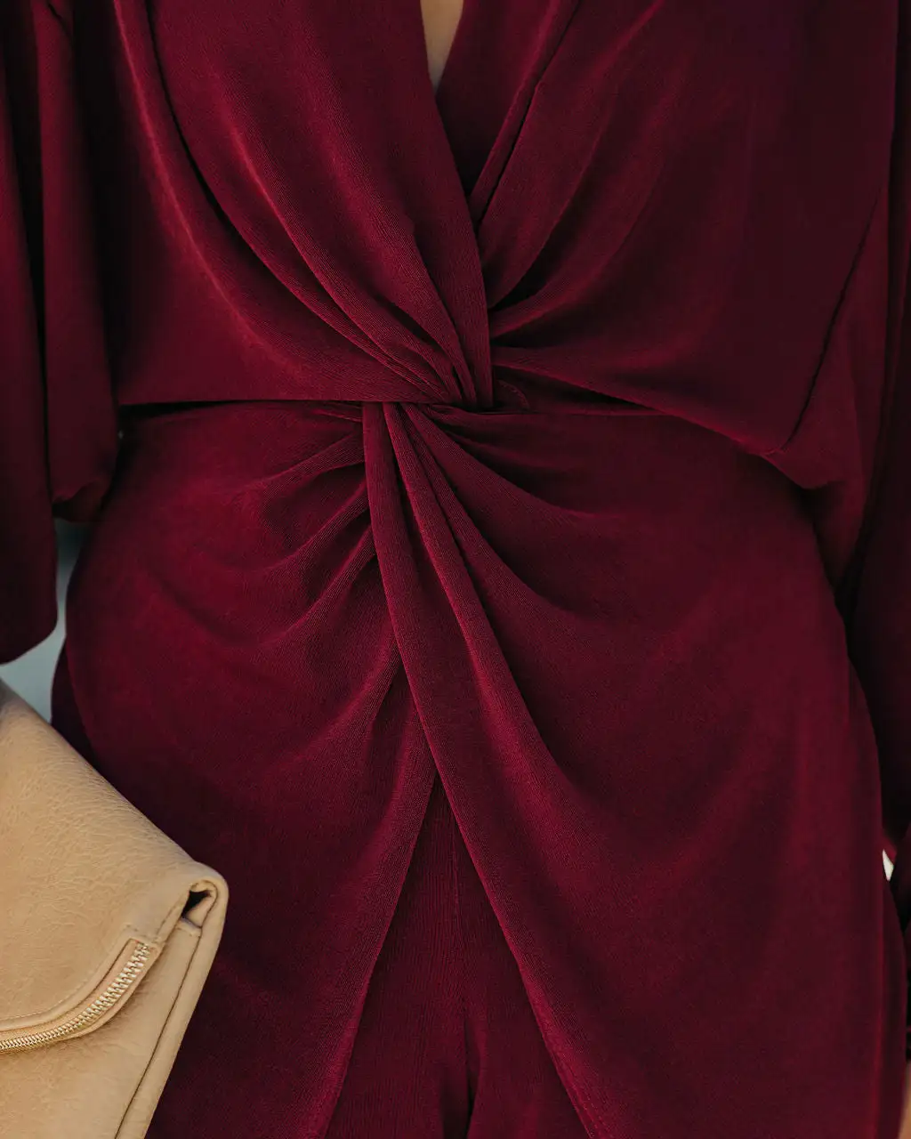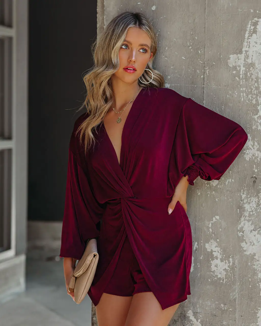 Demand attention in our In The Mix Twist Front Knit Romper! We love the flirty length on this wine knit romper. Designed with a draped neckline, long sleeves and elastic sleeve hems. Finished with a twist front detail and exaggerated back keyhole + neckline button closure. Styled with the Perfect Hoop Earrings, Chloe Mini Necklace, Gaia Coin Necklace, Stella Crossbody Envelope Zip Clutch, and Bella Faux Leather Strappy Kitten Heel.