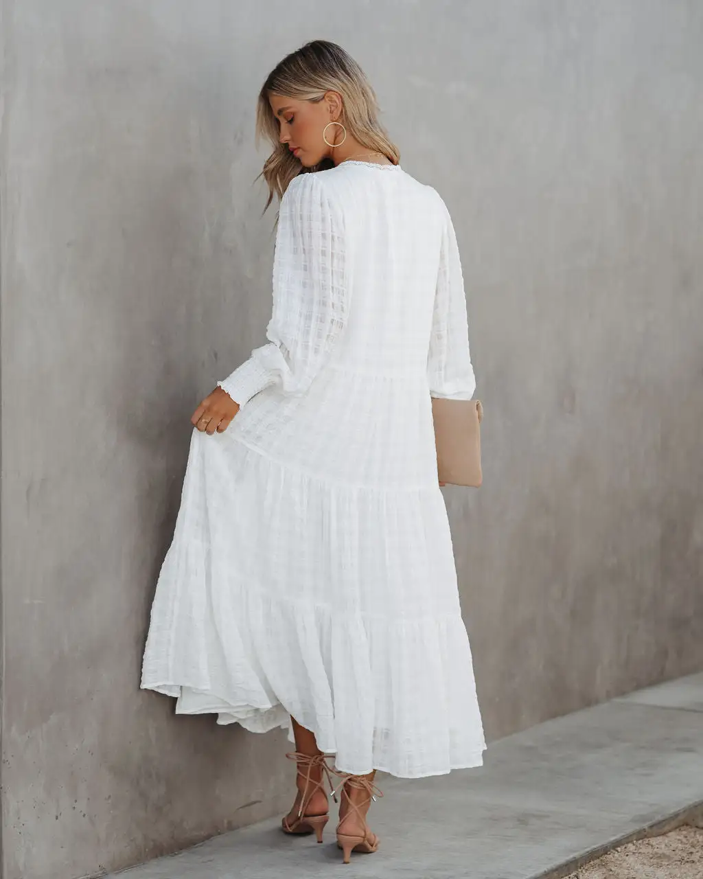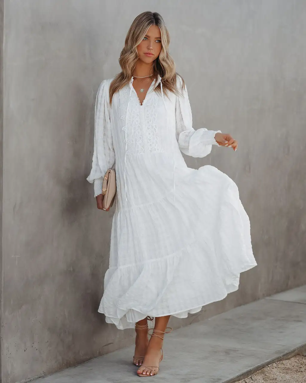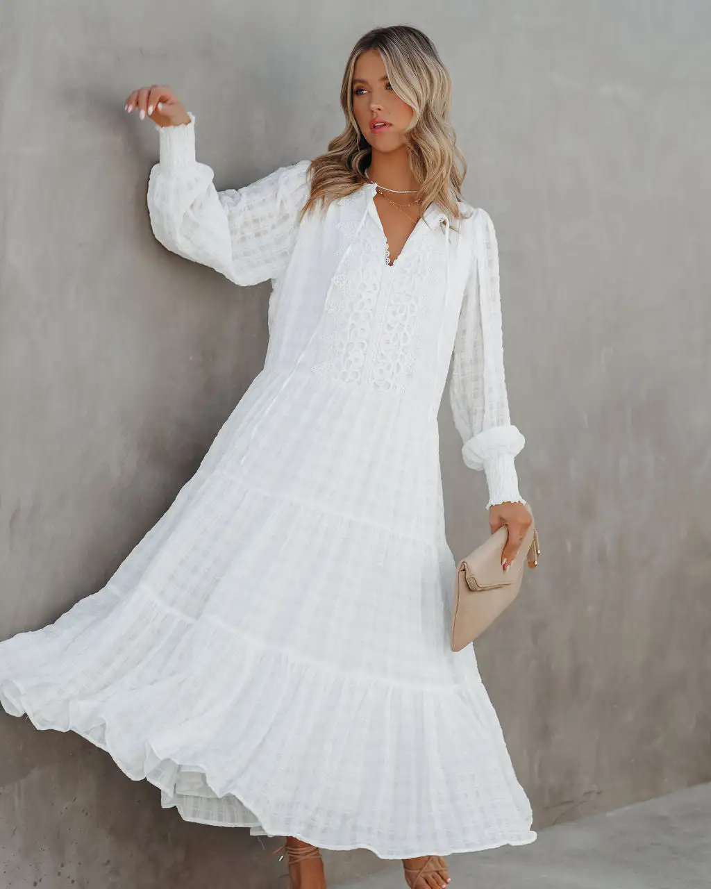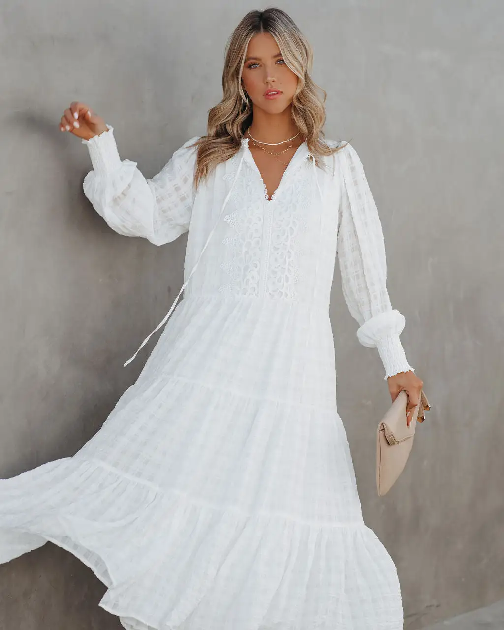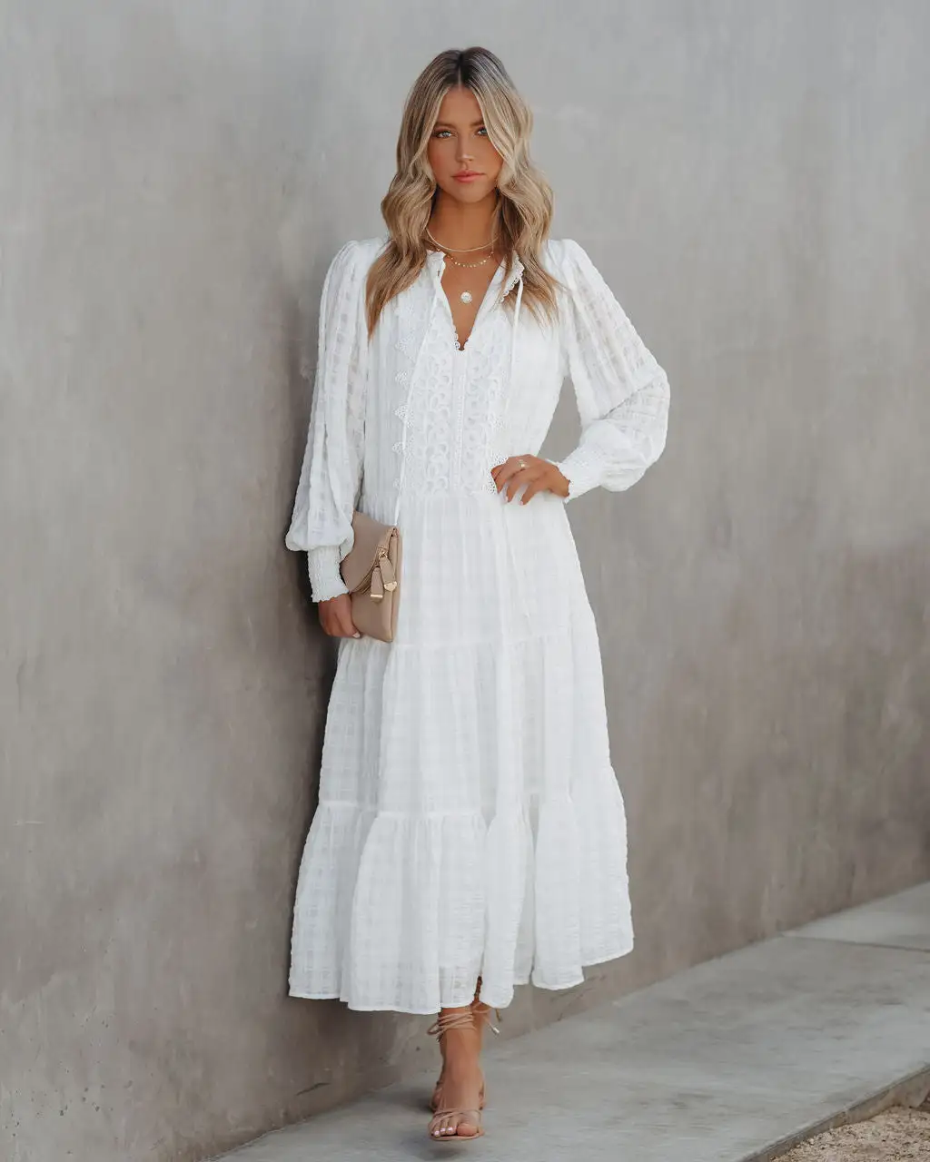 Our Jaylan Tiered Crochet Lace Midi Dress is ready for a vacation! This off white dress features a split neckline. Designed in a textured fabrication with a crochet trimming. Styled with the Bella Faux Leather Strappy Kitten Heel, Stella Crossbody Envelope Zip Clutch, Mosaic Coin Necklace, Chloe Mini Necklace, and Perfect Hoop Earrings.