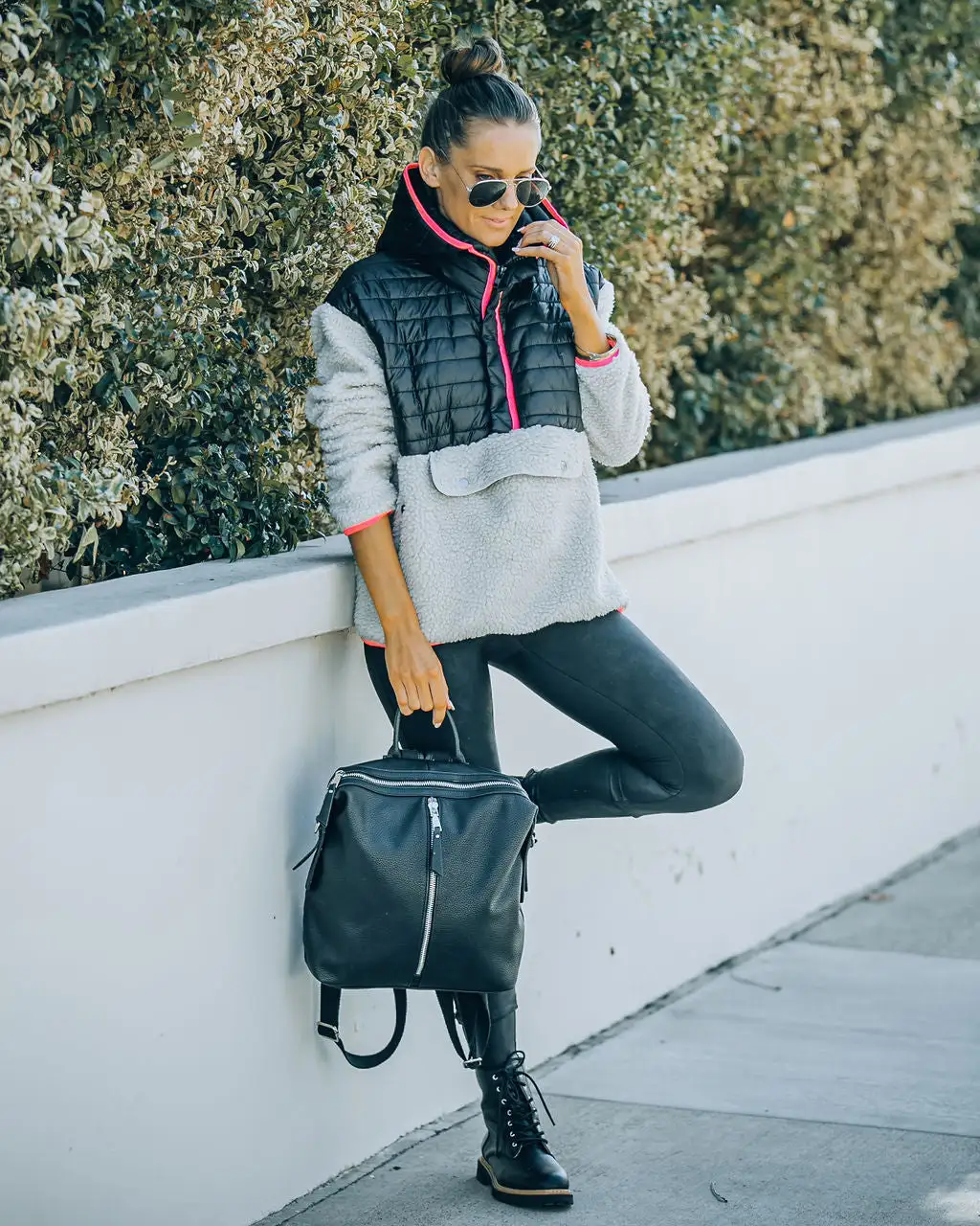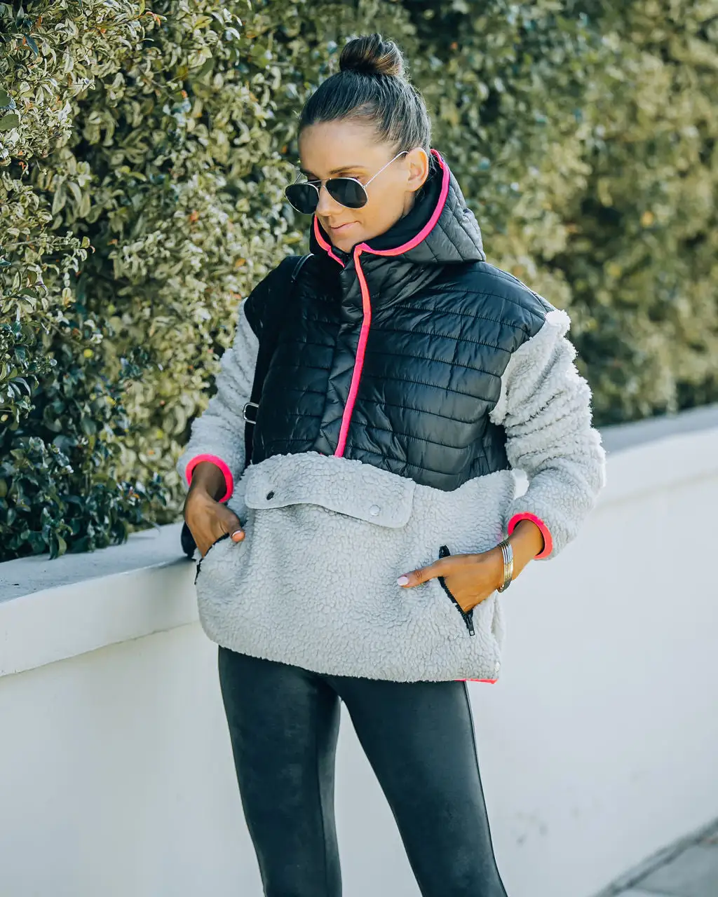 Take a trip to the snow in our Jazelle Pocketed Half Zip Sherpa Pullover! This cream jacket features a contrast black puffs and hot pink edges. Designed with a half zipper closure and side pockets. Style with the Chloe Mini Necklace, Initial Card Necklace, Simple Bangle Bracelet, Kenzie Backpack, Faux Leather Leggings, and Brycen Faux Leather Lace Up Boot.